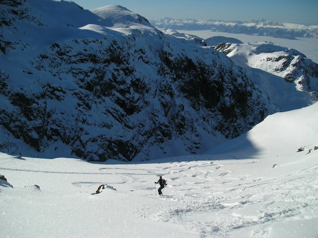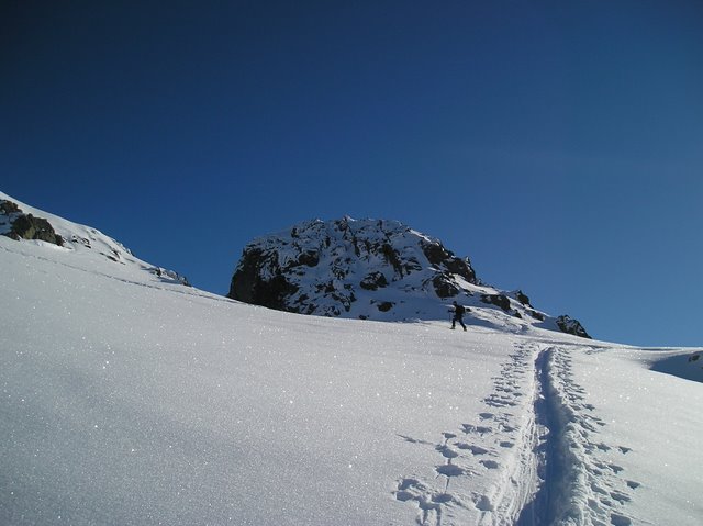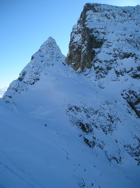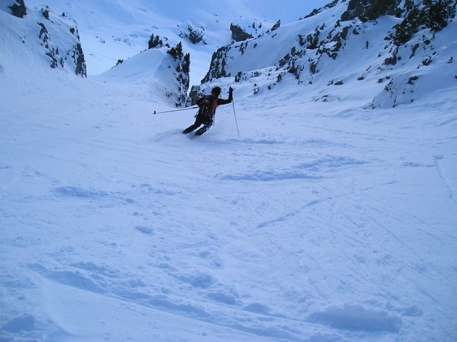 A la descente on a opté pour un couloir à droite de celui de montée en meilleures conditions (pas de traces, relief régulier).