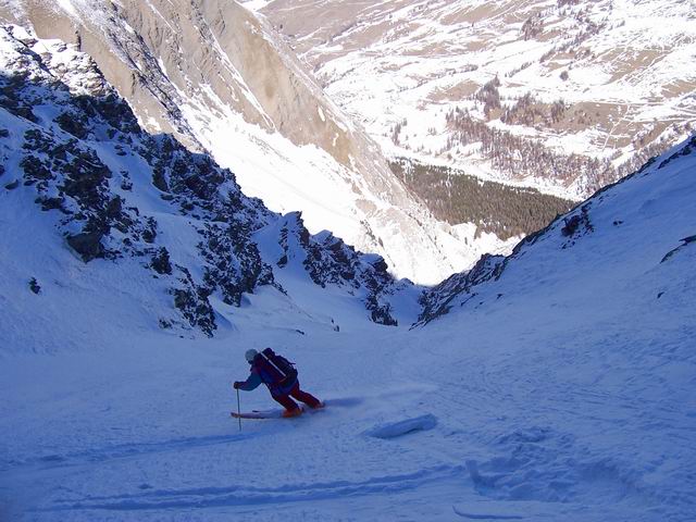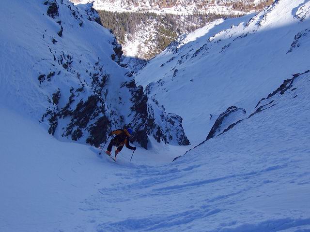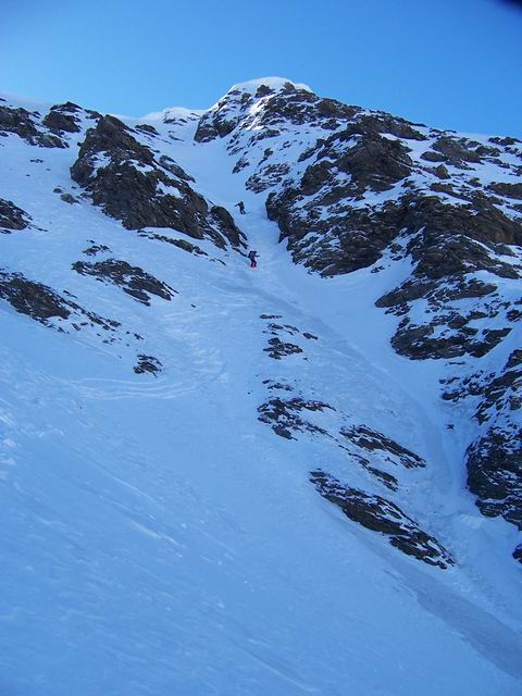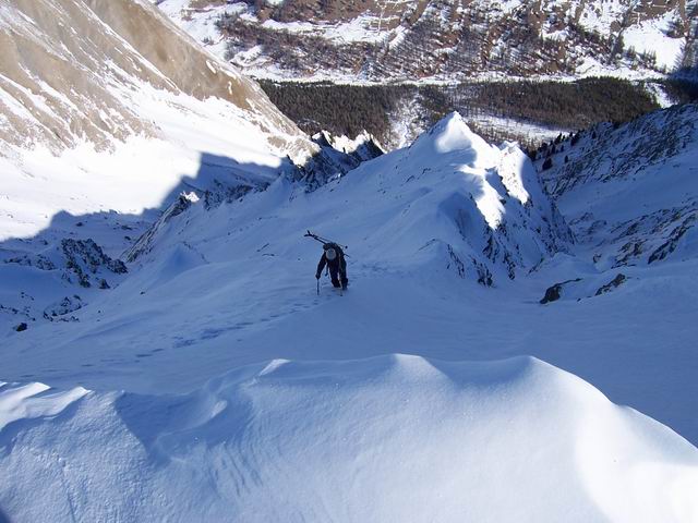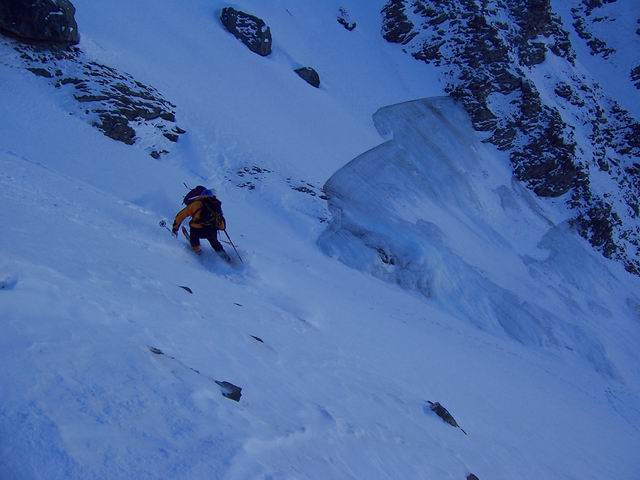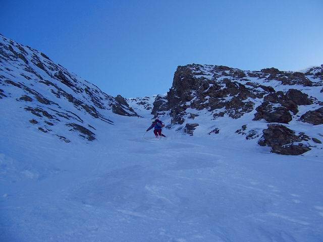 Sortie bizarre avec pour commencer un fourvoyage dans ce vallon paumatoire qui nous amène sur une plaque dont le bruit de tassement nous glace le dos alors que nous venions de vérifier que l?encrage semblait correct. Puis Daniel qui rechigne à descendre à vue le bon couloir, mais qui se laisse convaincre que c?est mieux que de repasser sur cette pente plaquée, qui attaque bille en tête avant de se retrouver un peu plus bas immobilisé et pétrifié sur une 1ère plaque de glace bien masquée par la petite couche de poudre. Suite de la descente après un sauvetage collectif de notre gladiateur, pour nous apercevoir que le 2ème ressaut ne sera pas négociable. Nous avions fait le bon choix de prendre les casques, mais le mauvais de ne pas prendre la corde. Après une remontée, une re-descente, un sentiment aigre-doux avec d'excellents passages que nous n'avons pas réellement appréciés pour être t