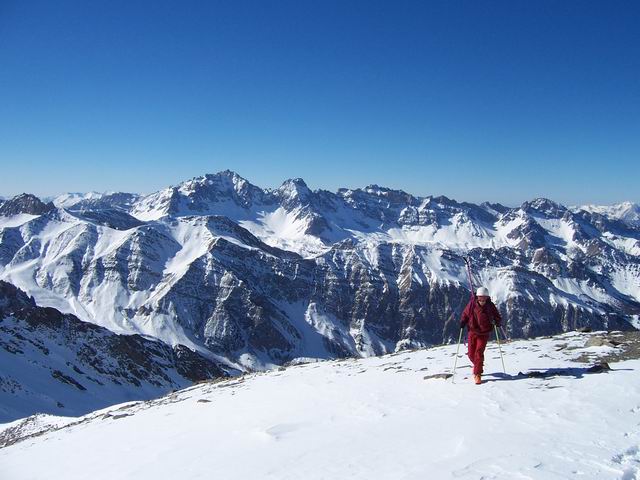 Suite à erreur de couloir, nous sommes sortis sur l?arête plus bas que prévu, et en avons suivi le versant sud jusqu?à la pointe 3040, puis de là un aller retour au sommet principal. Pour la descente, nous avons cette fois plongé dans l?entonnoir nord-ouest puis le couloir qui lui fait suite, pour s?apercevoir à 2600m qu?un ressaut tout en glace ne passait pas. Remontée à l?arête, et 2ème descente par notre 1er itinéraire de montée. A noter une erreur dans le topo qui indique une orientation NE