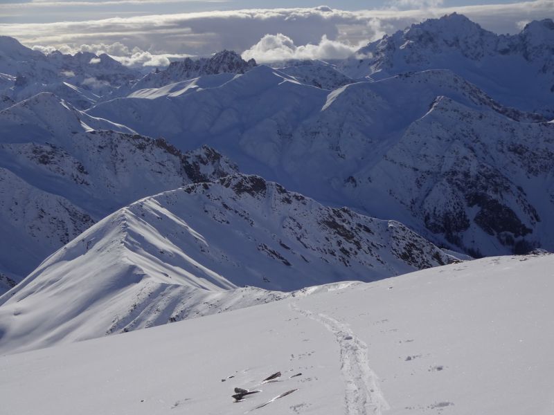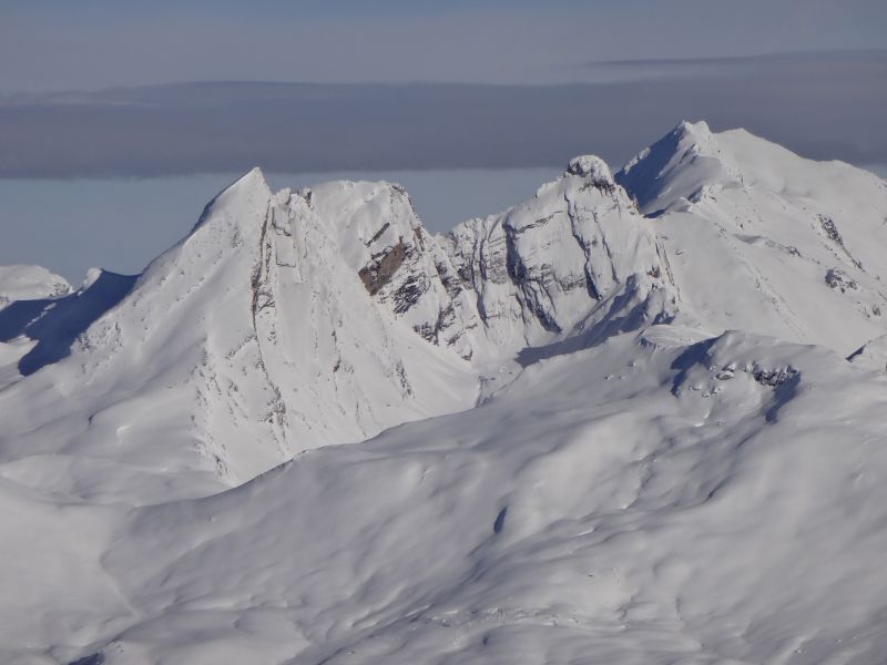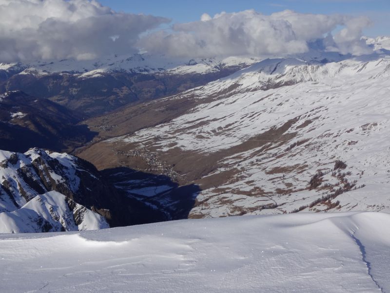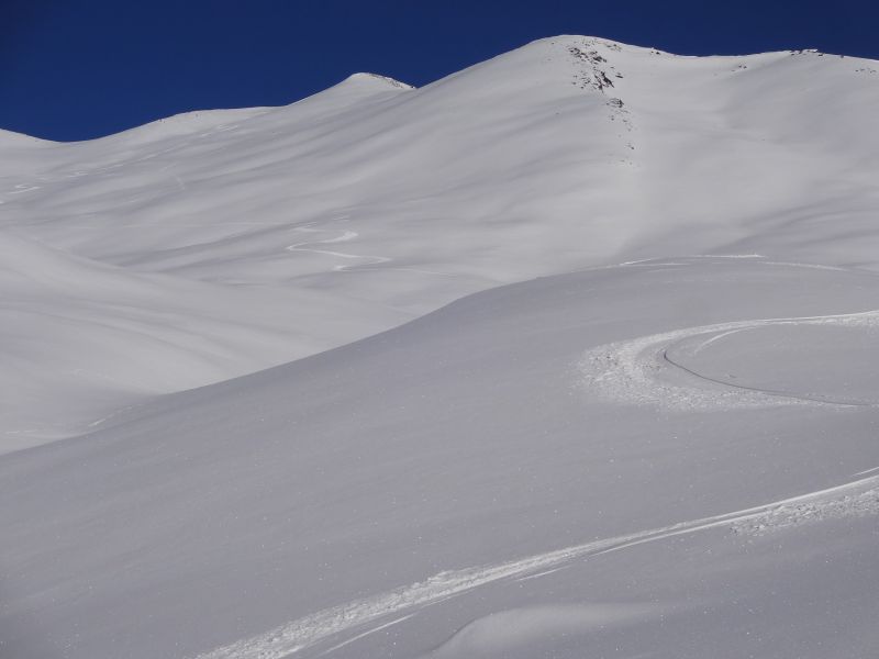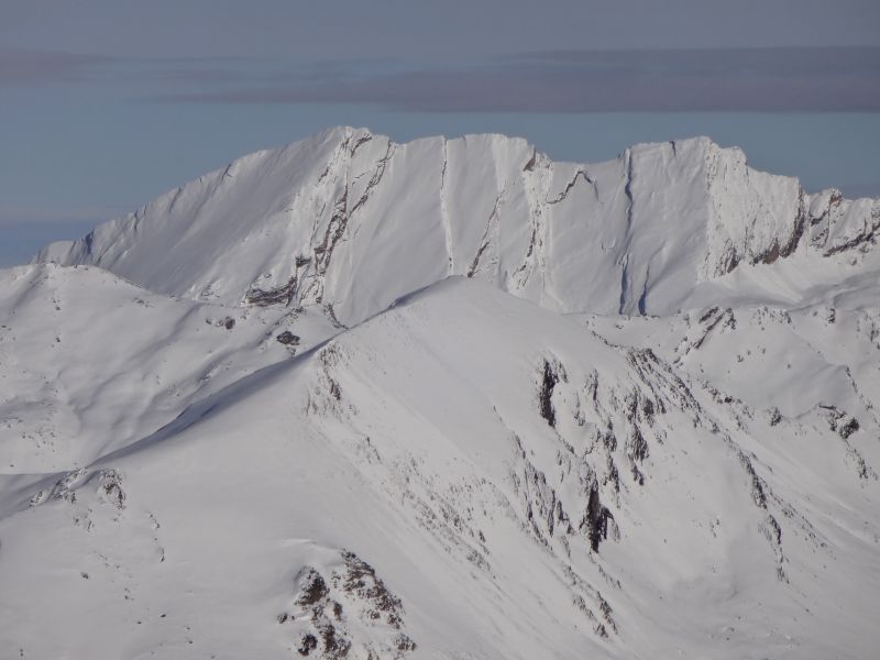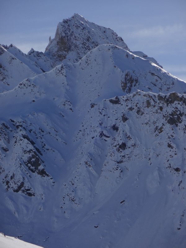 La neige a disparu en couverture continue au dessous de 2000. A partir de 2200 le sol est parfaitement "englué" dans une couche de 20cm augmentant rapidement, transformée par les pluies et redoux et figée par le gel de cette nuit. Le phénoméne a dépassé les 3000 mais dés 2500 en nord sous la poudre d'hier soir c'est 30cm de neige tassée mais pas dure avec parfois dessous une couche variable peu consistante. Stabilité semble t'il excellente sur tout ce versant. Des coulées visibles vers Clausis ou Roche Noire datant de la phase de redoux.Beaucoup de courses du secteur semblent en bonnes conditions.