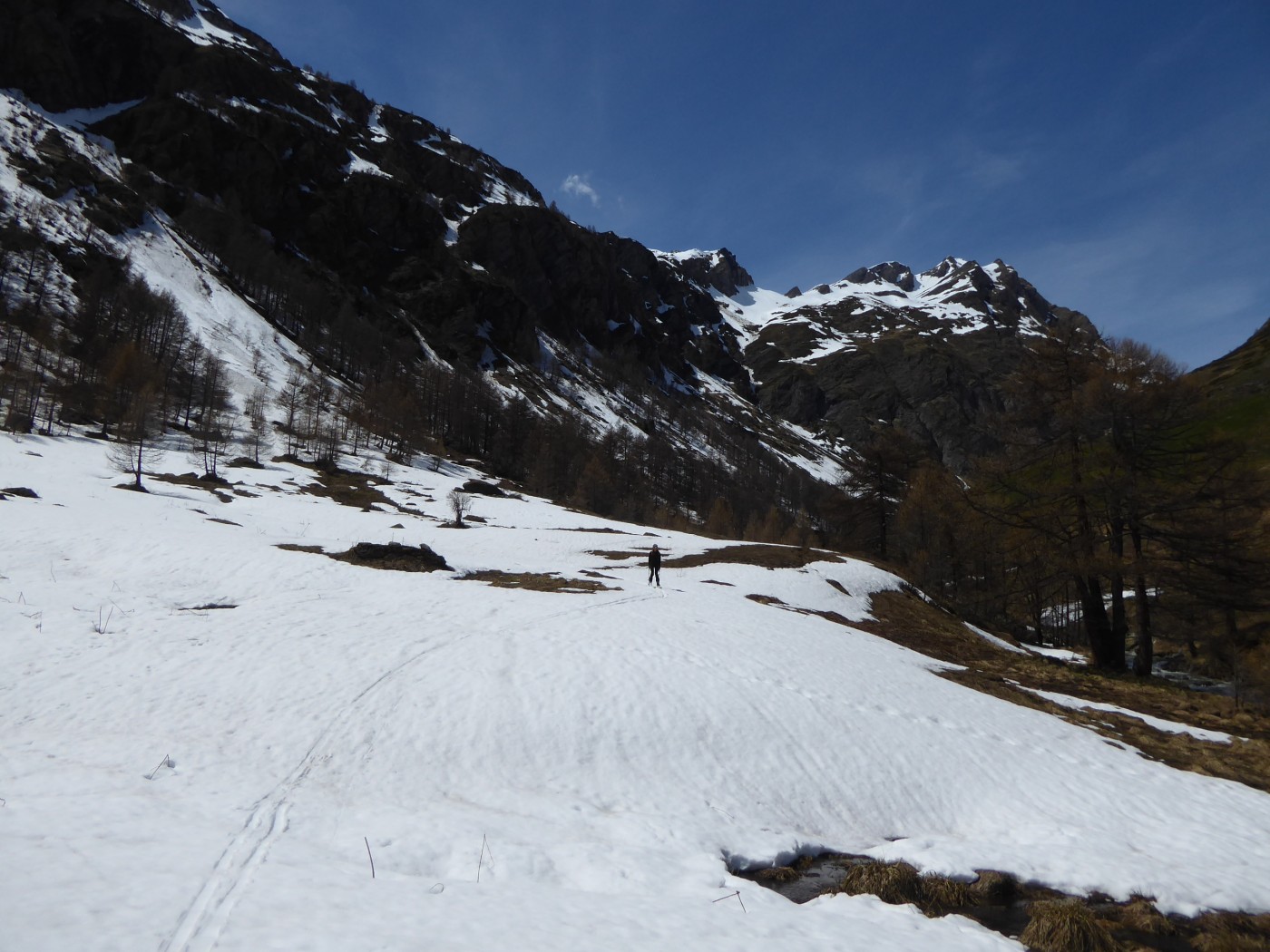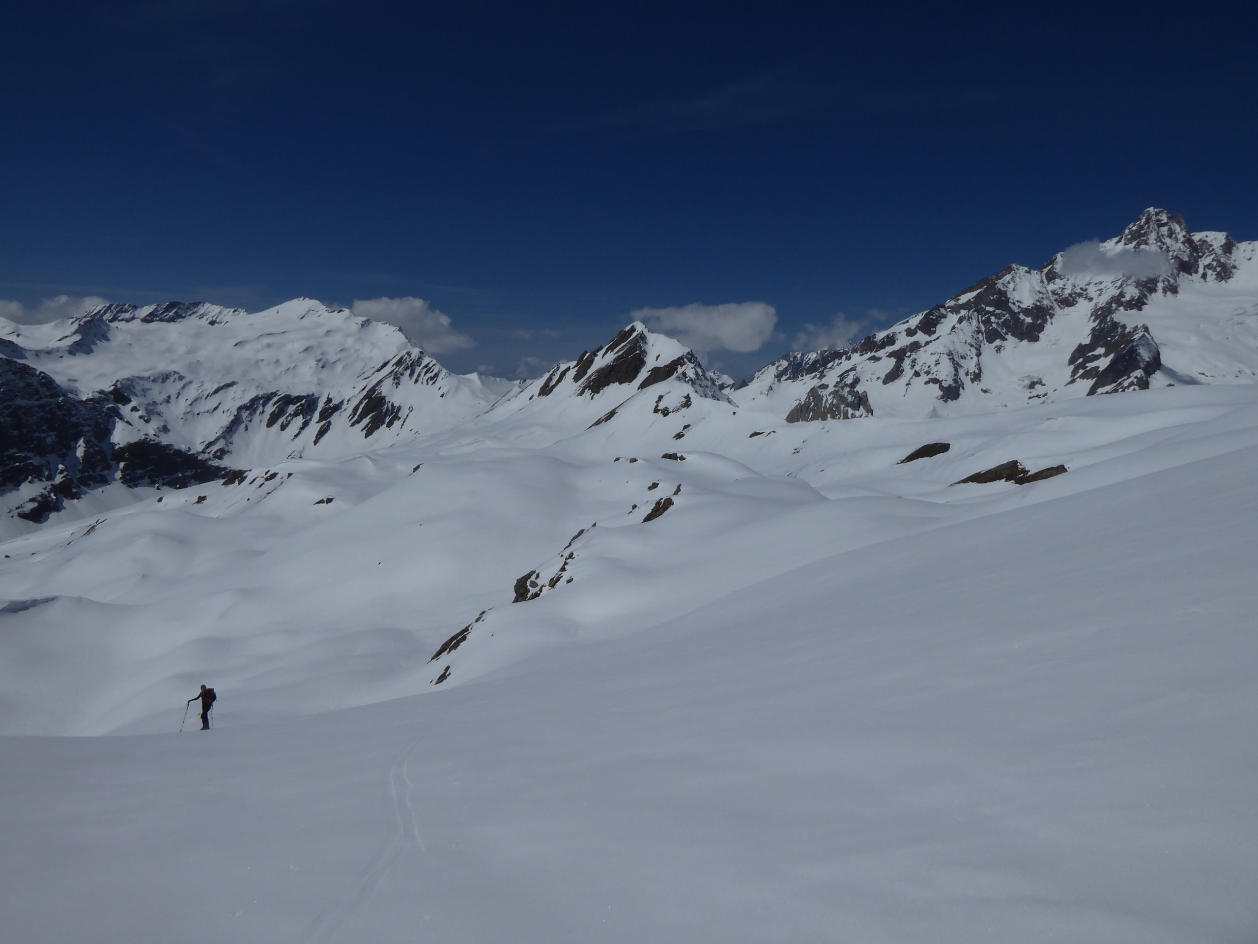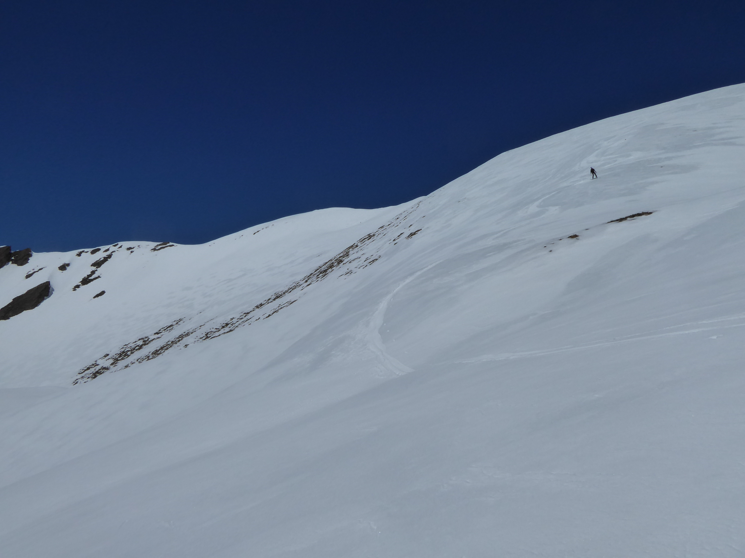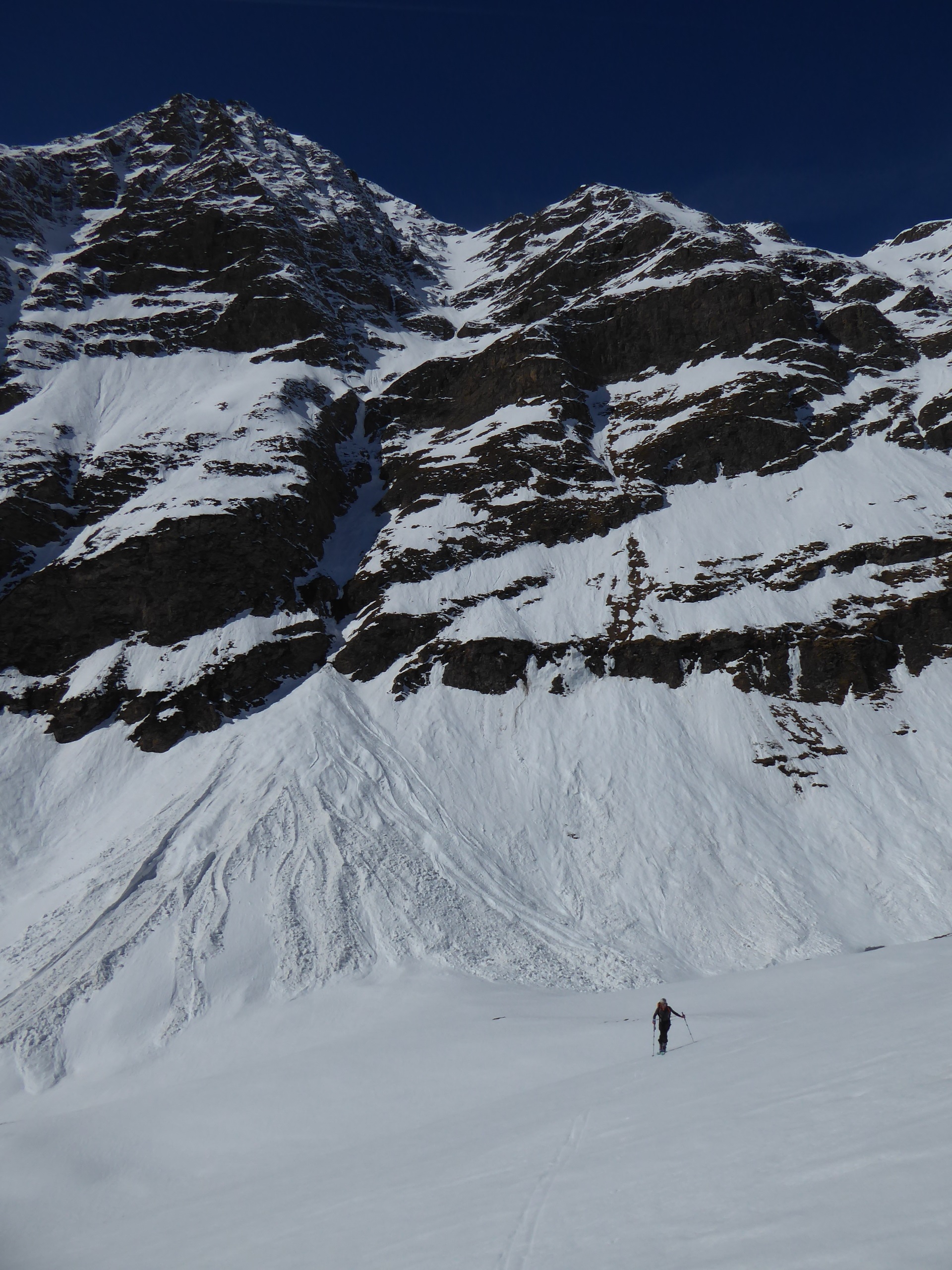 Neige transformée avec un bon regel à tous les étages sur cette itinéraire tourné vers le sud. Les pentes E et O qui dominent le bas du vallon des Chavannes ont bien purgé laissant dans le fond du vallon des dépôts souvent terreux.