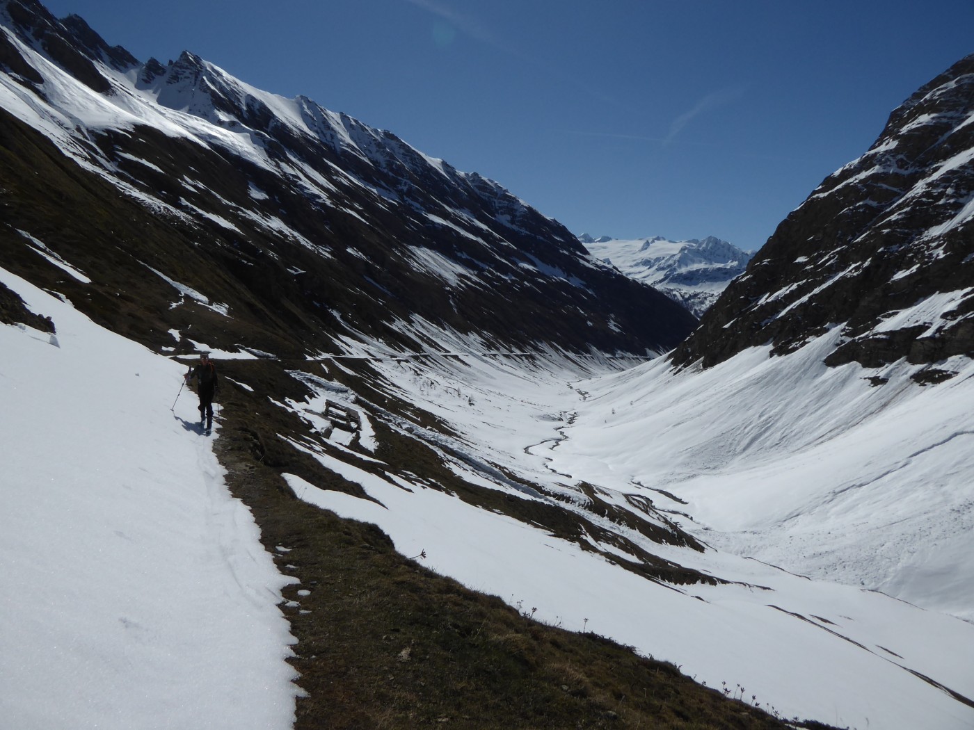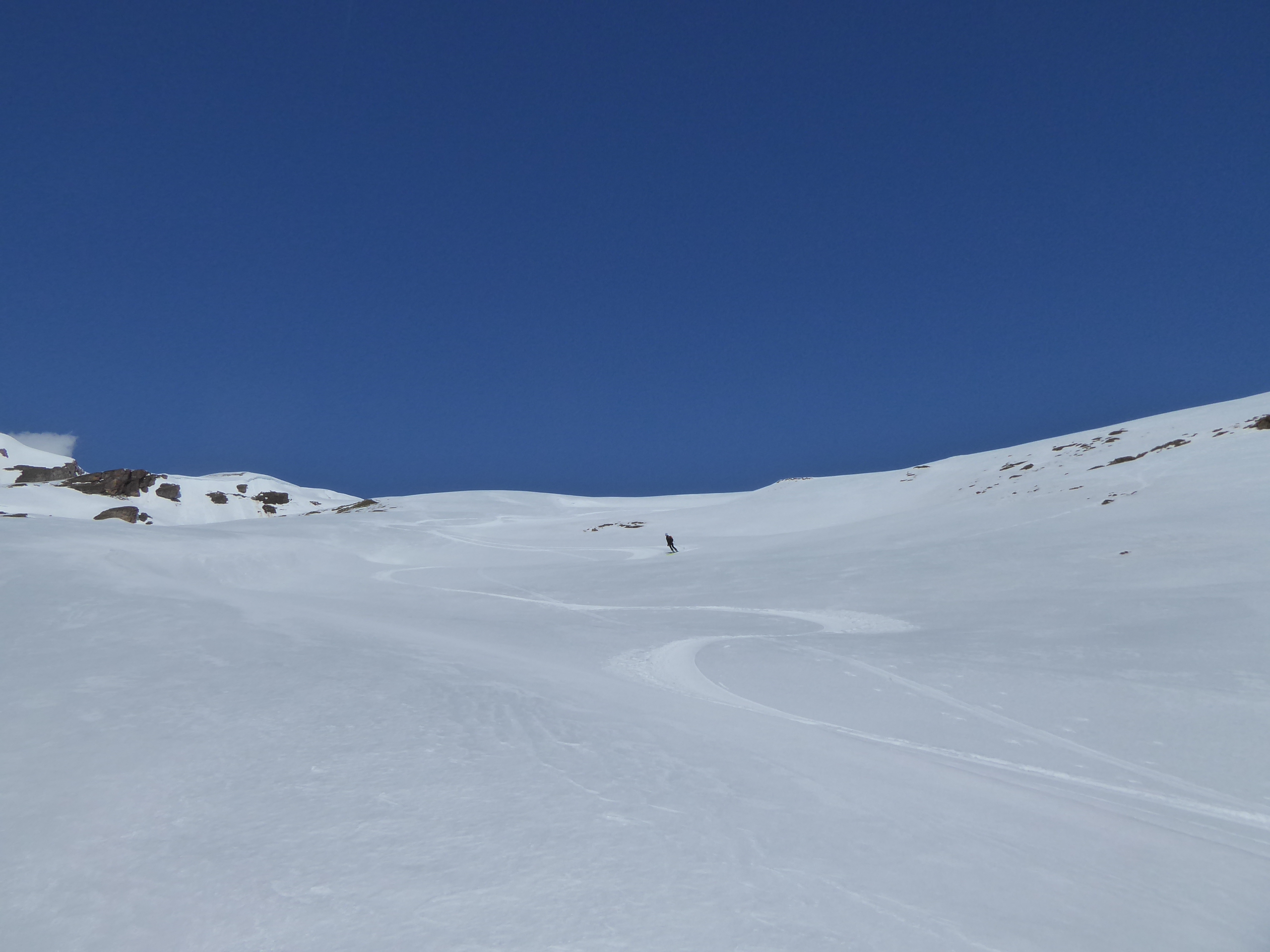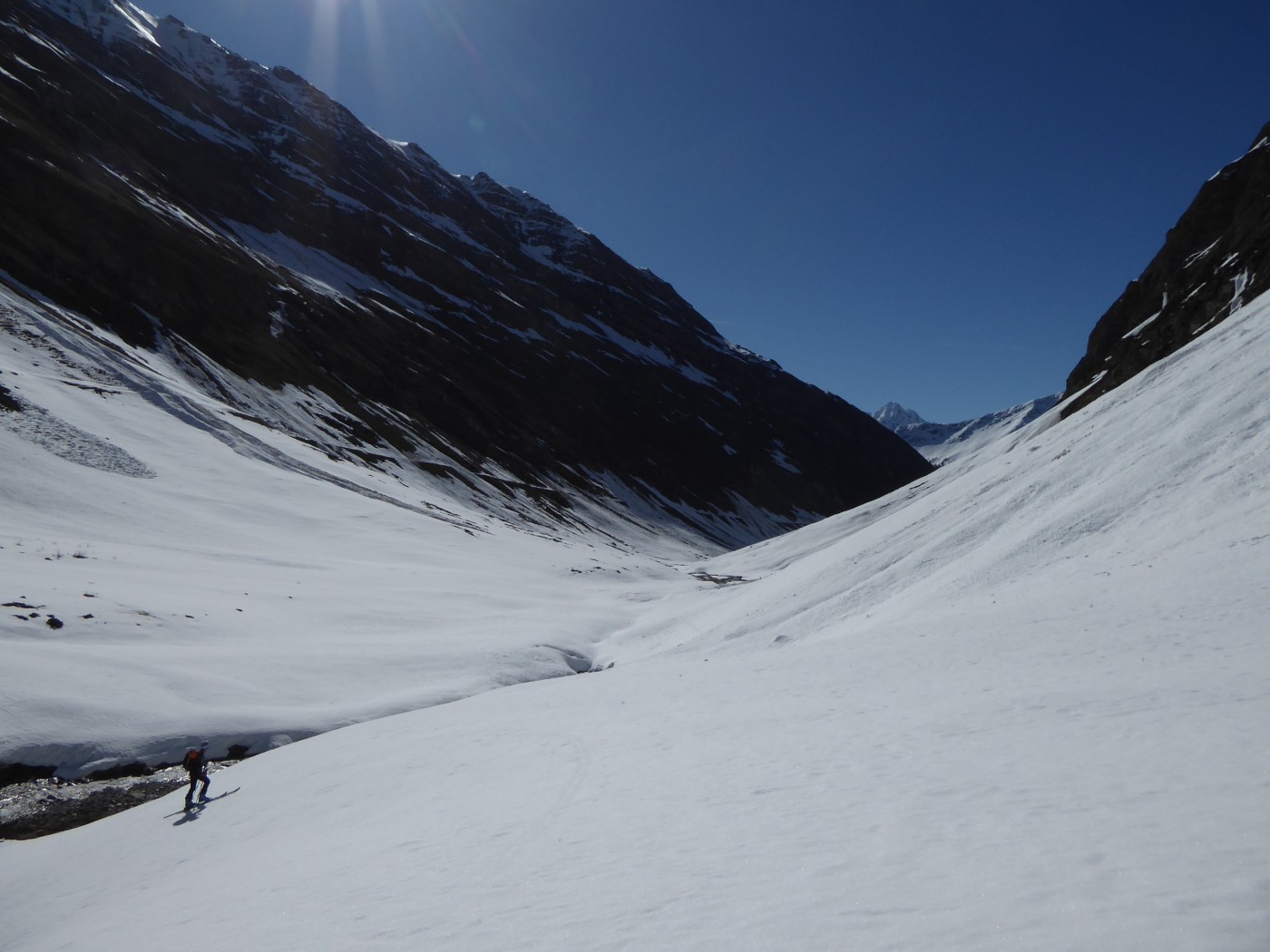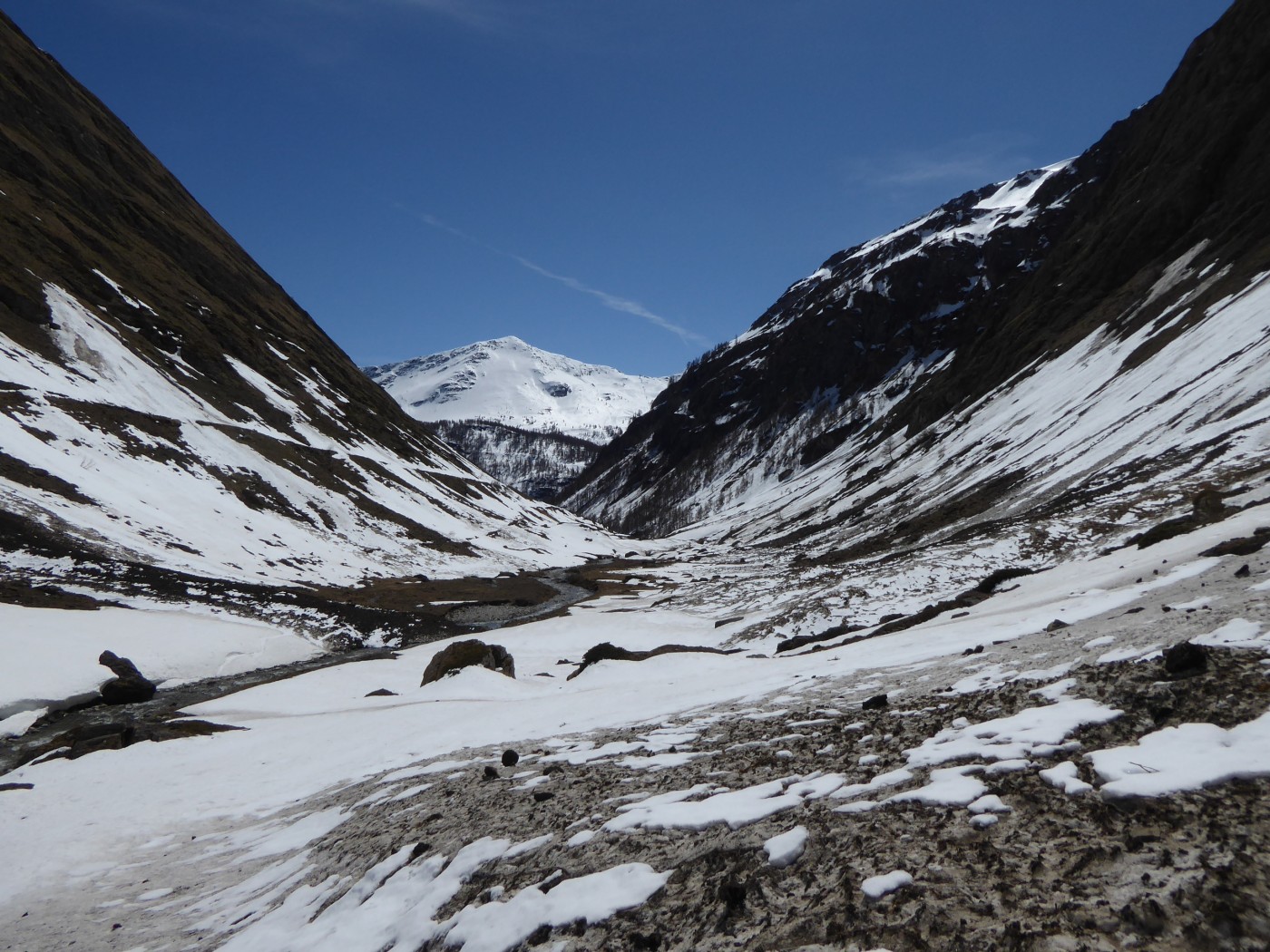 Neige transformée avec un bon regel à tous les étages sur cette itinéraire tourné vers le sud. Les pentes E et O qui dominent le bas du vallon des Chavannes ont bien purgé laissant dans le fond du vallon des dépôts souvent terreux.