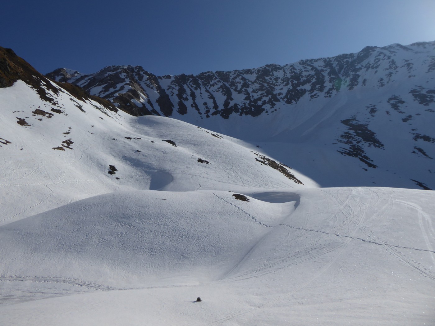 Petite variante de C22.2 qui permet d'augmenter le dénivelé et de skier sur deux orientations (E puis SO et O). Le couloir SO de la pointe des Grands est en conditions moyennes : pas très fourni, nombreuses traces de passages et quelques boules. La descente en versant E et la partie sous le couloir et la traversée pour rejoindre la descente du col du Passon étaient les plus agréables à skier. Le bas de la descente du Passon est le moins bon : neige trafollée souvent dure voire raclée très dure dans les zones très parcourues.
