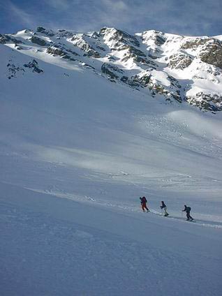Superbe itineraire a deux pas de Saint Veran, mais au cadre grandiose. Le parcours de l'arete est somptueux, avec juste l'ambiance qui va bien pour nos jeunes apprenties randonneuses. Le couloir etait en excellentes conditions, vierge de traces, alors que les pentes qui bordent les rochers de l'Automniere etaient deja bien trafolles