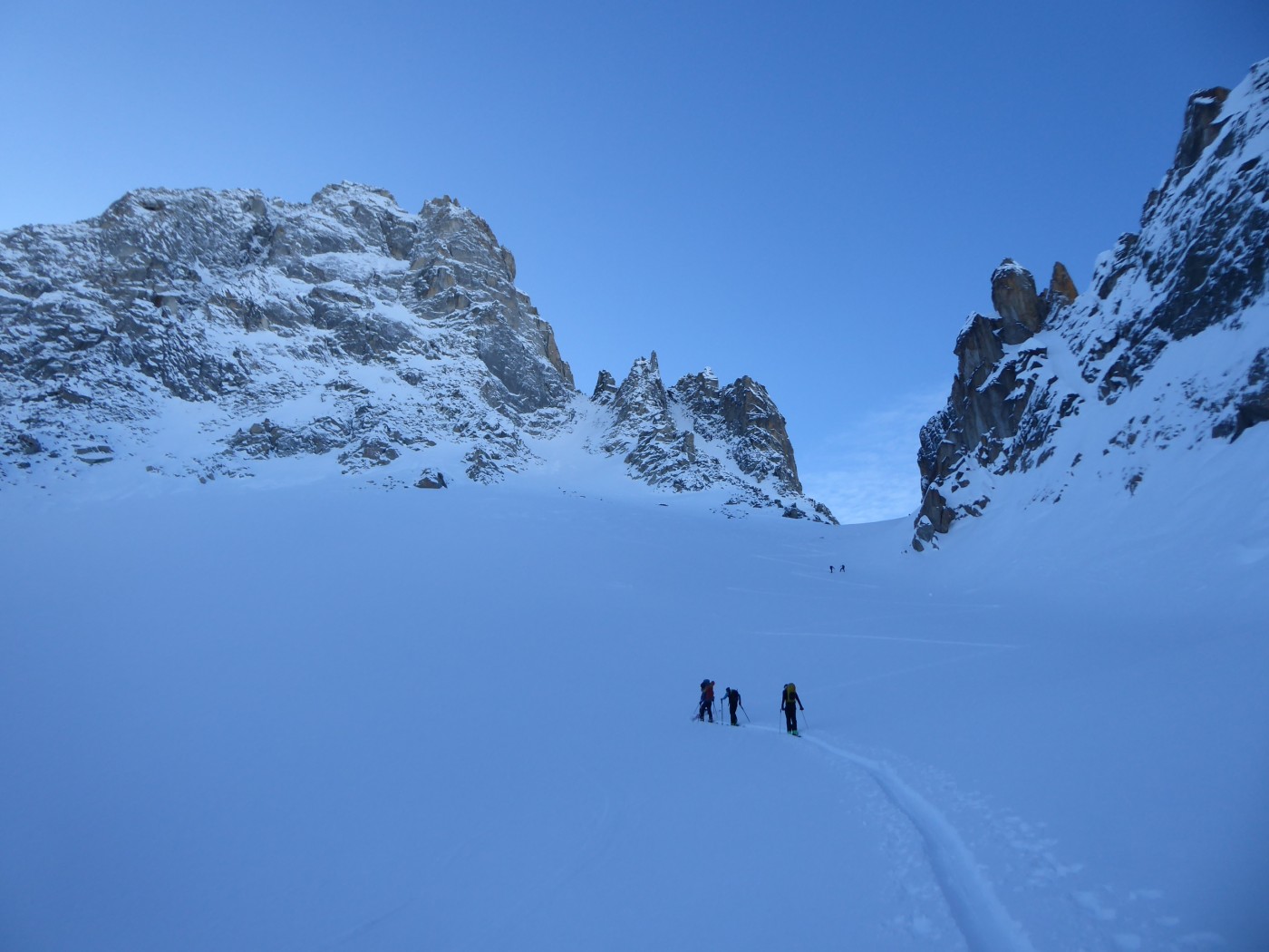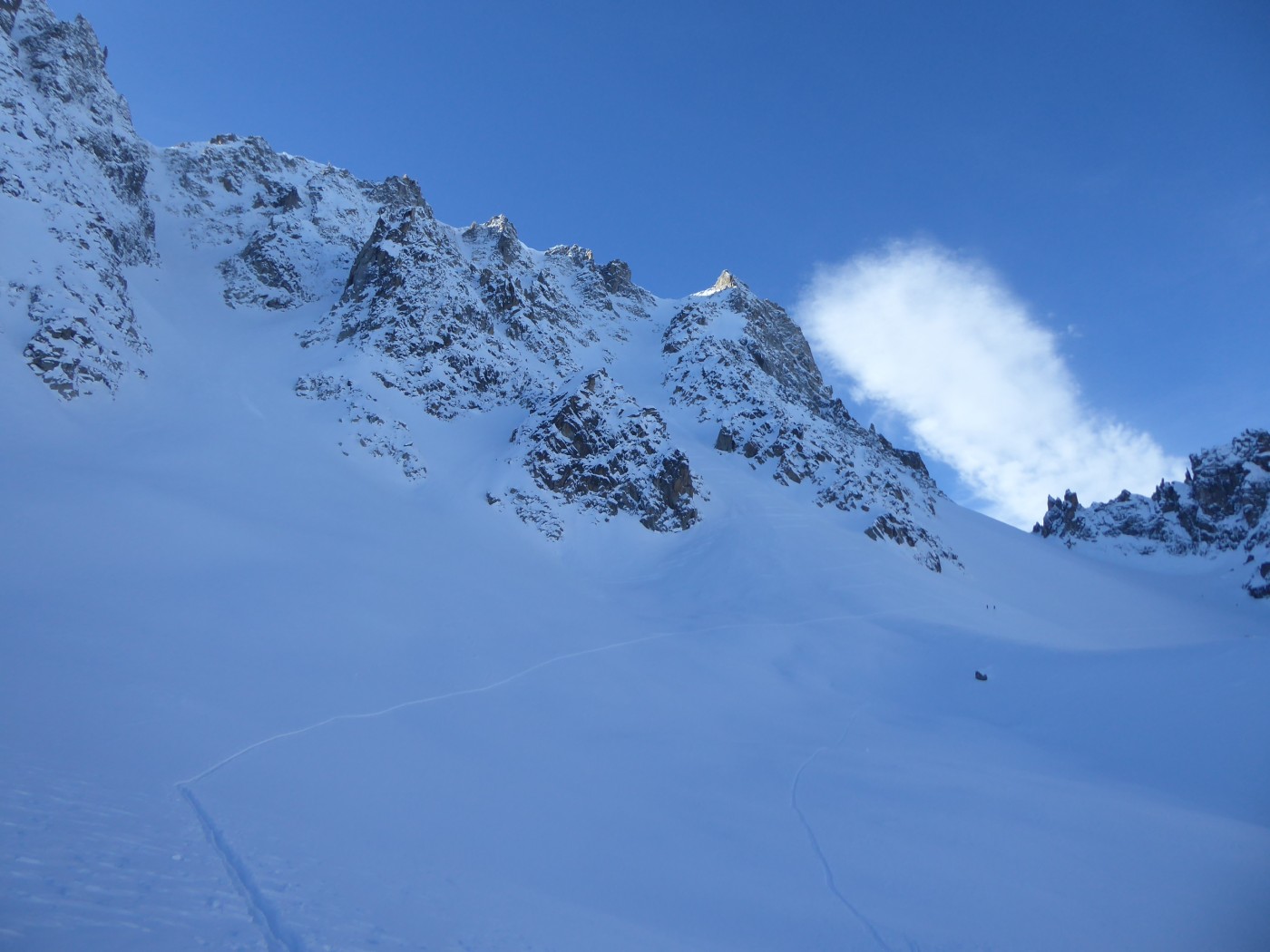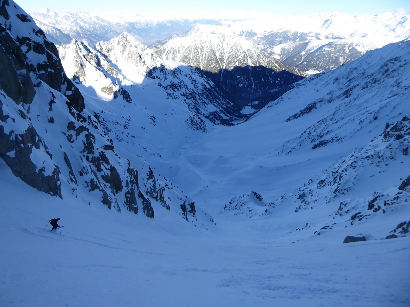 Bon enneigement dans le val d'Arpette : 10 cm de poudreuse un peu croutée par endroits par le vent mais agréable à skier. Dans le couloir NE de la petite pointe d'Orny, la neige est meuble mais un peu ventée et déjà pas mal tracée. Meilleure poudreuse sur les bords du couloir.