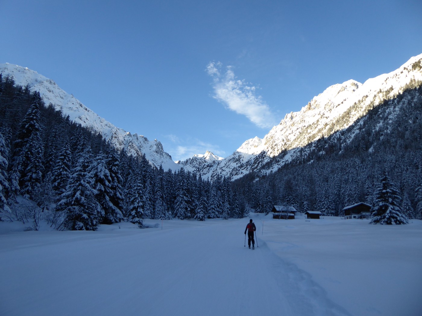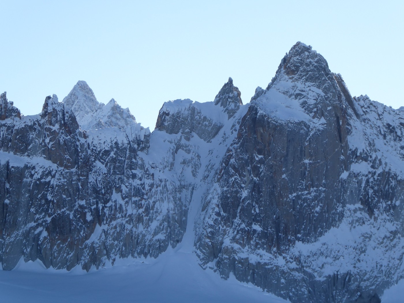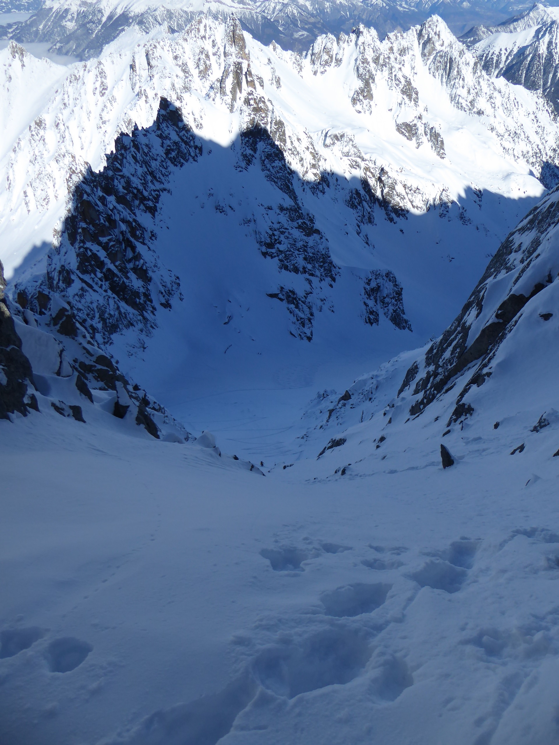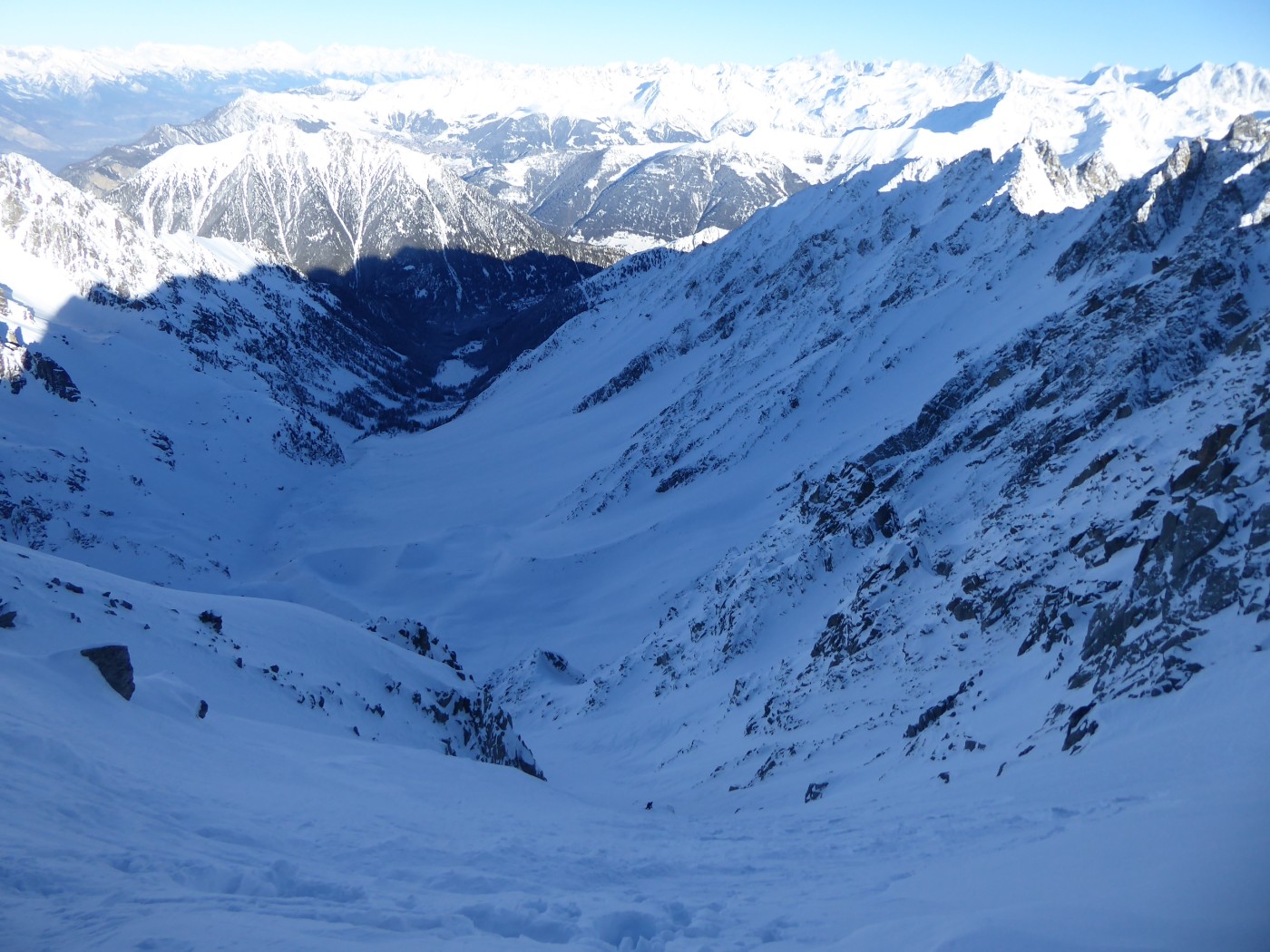 Bon enneigement dans le val d'Arpette : 10 cm de poudreuse un peu croutée par endroits par le vent mais agréable à skier. Dans le couloir NE de la petite pointe d'Orny, la neige est meuble mais un peu ventée et déjà pas mal tracée. Meilleure poudreuse sur les bords du couloir.