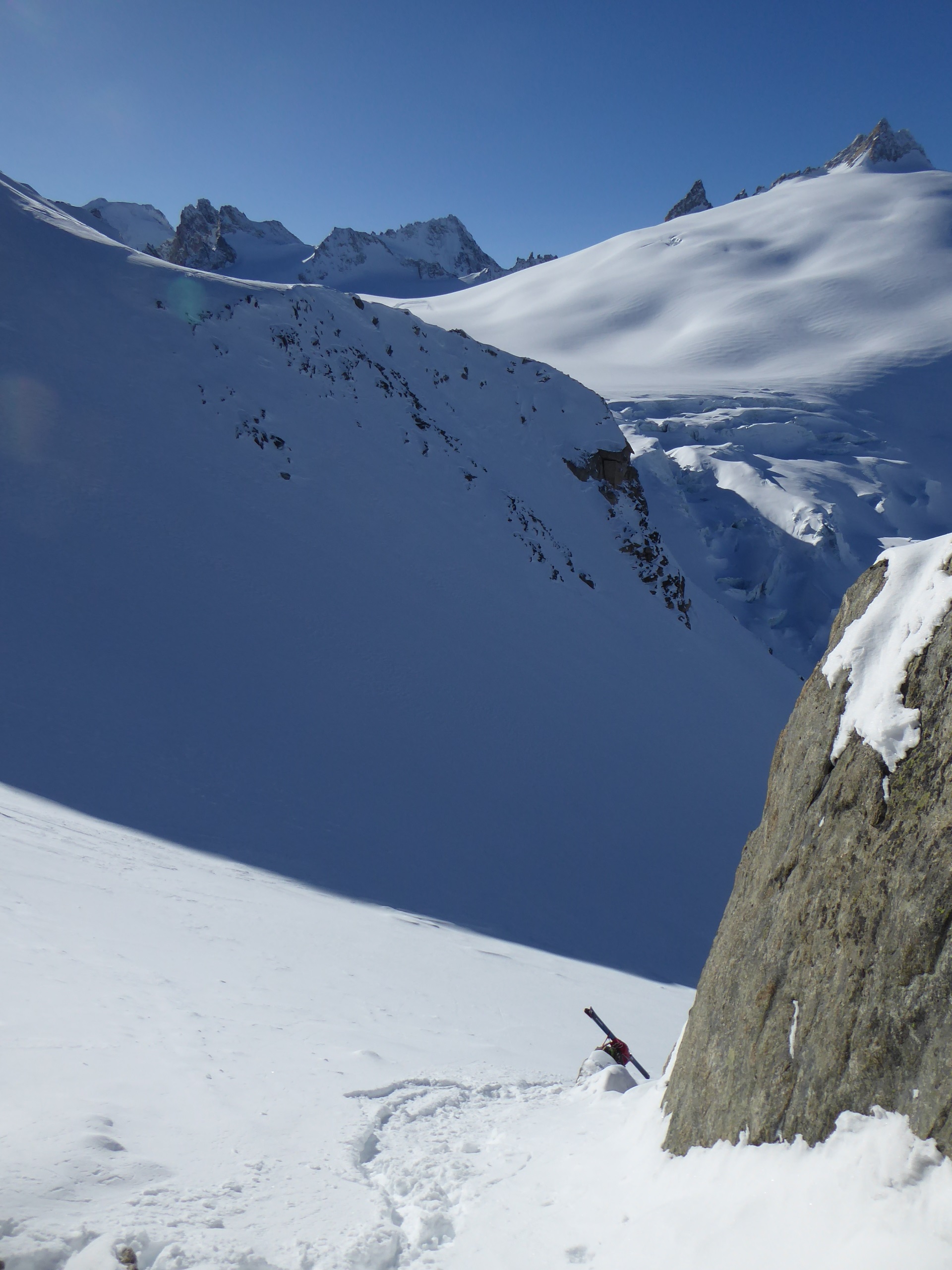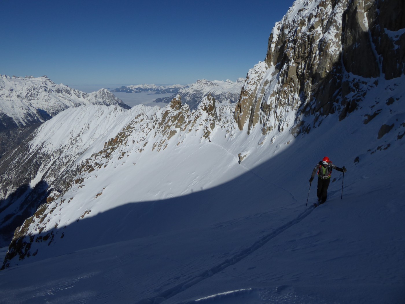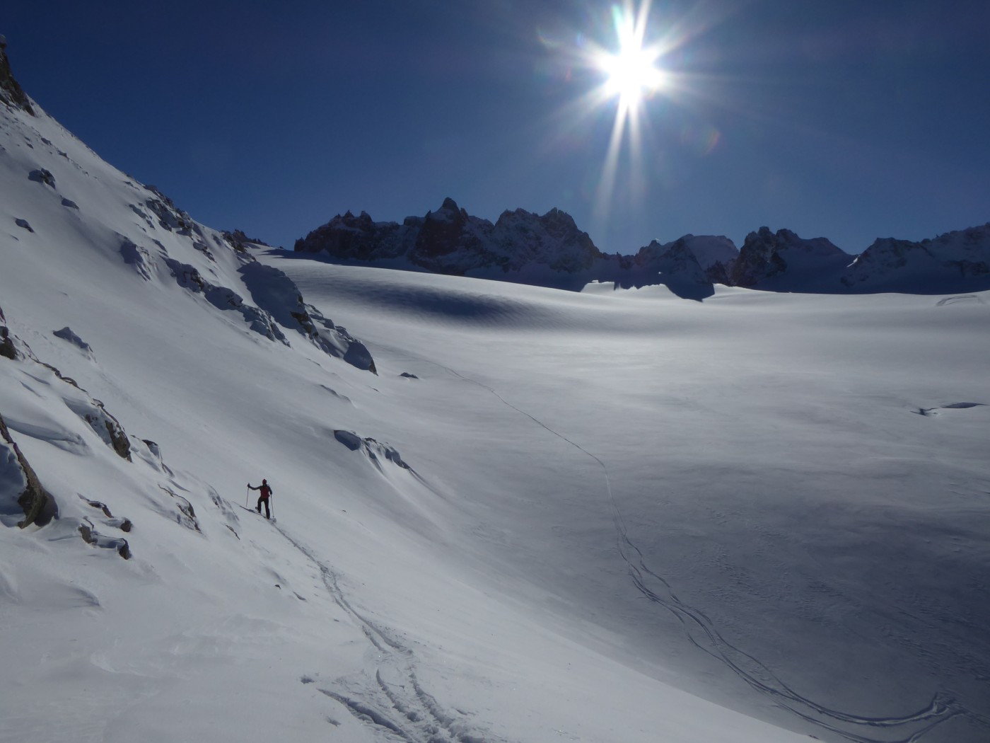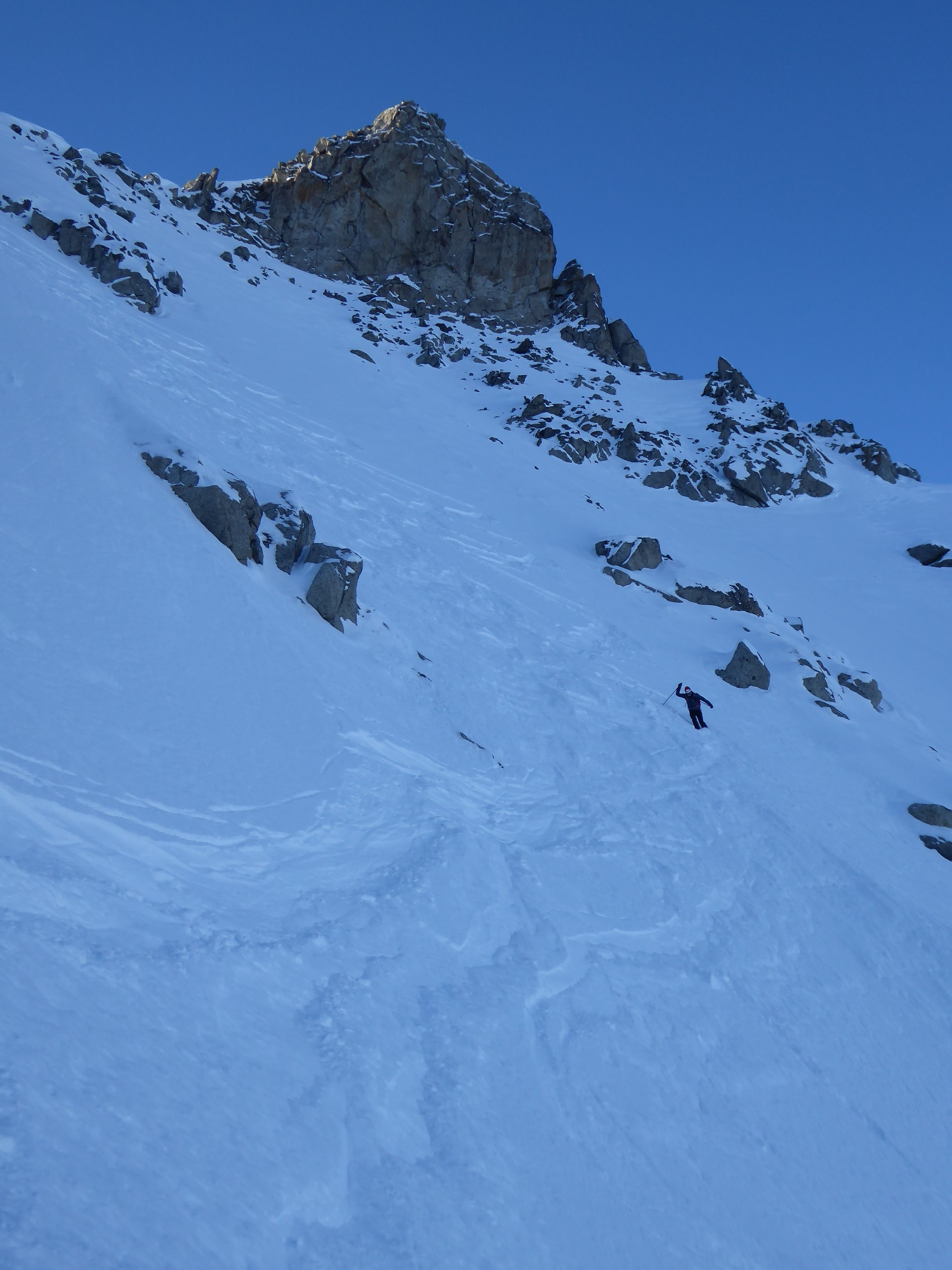 Jolie boucle qui permet de profiter du soleil entre la fenêtre du Chamois et le sommet. Une vingtaine de skieurs dans le val d'Arpette pour ce premier jour de beau de la semaine. Le couloir NE de la petite pointe d'Orny est déjà pas mal tracé (environ 10 traces), quelques traces aussi dans le couloir nord de la pointe d'Orny (D15). Nous sommes descendus à pied du sommet à l'entrée du couloir, l'enneigement sur les crêtes ne permettant de vraiment skier sans abimer les skis. Sinon c'était un peu le salon de l'aviation dans le secteur entre les rotations d'hélicos pour les déposes au col des Plines, les avions de tourisme qui font des touch and go sur le plateau du Trient et deux avions de chasse qui ont survolé le plateau du Trient quand nous étions sur l'arête NO des pointes d'Orny.