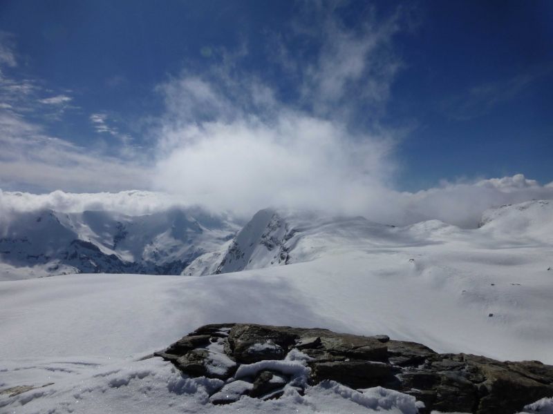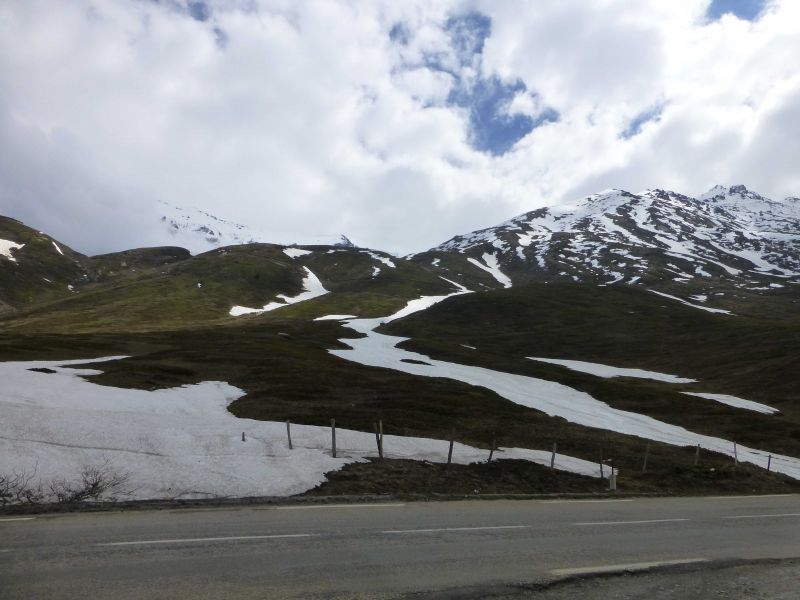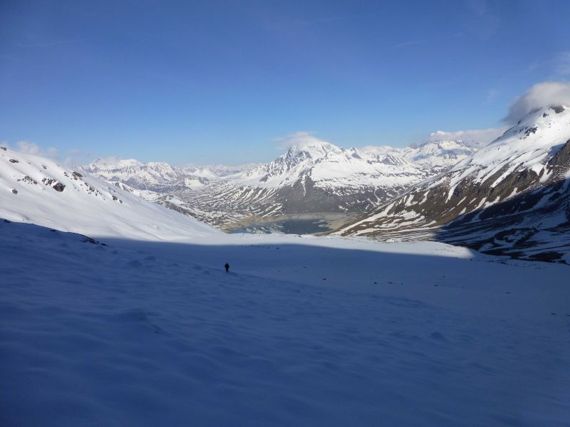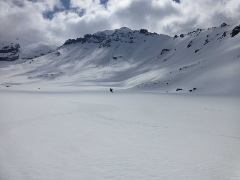 Nous sommes descendus vers 10h, sans doute un peu tôt mais les nuages arrivaient versant Italien. Neige encore dure mais agréable à skier (car lisse) sur le haut puis ski excellent en dessous de 3200m avec de la neige légérement revenue. Nous avons skié jusqu'à la route avec un petit déchaussage de 50m, en restant le plus à gauche possible, ,dans un petit vallon.