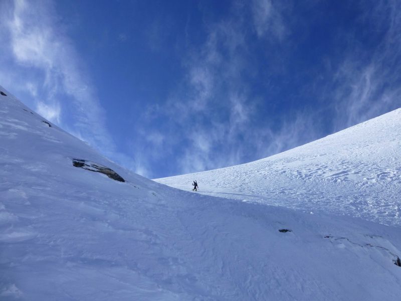Neige trés dure. Couteaux utiles. Crampons indispensables pour la partie raide (mais courte). Nous n'avons pas utilisé de piolet.