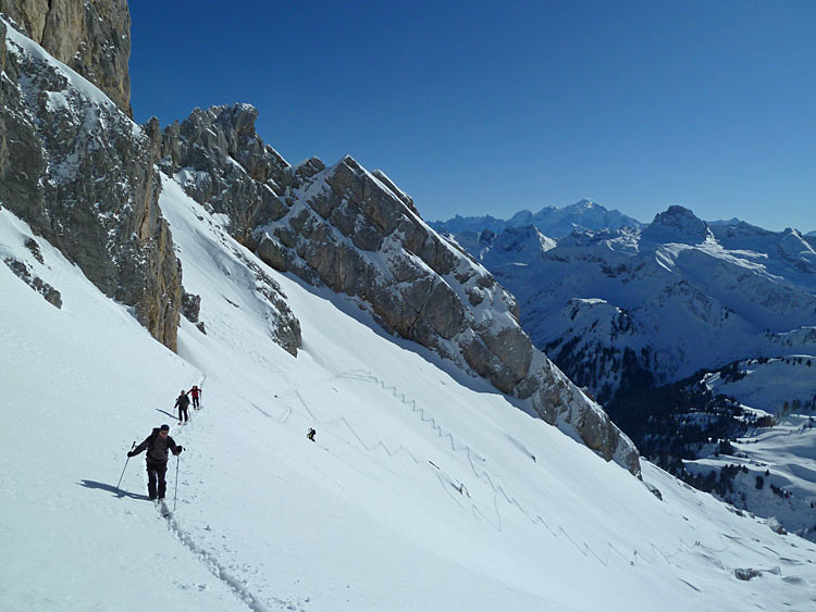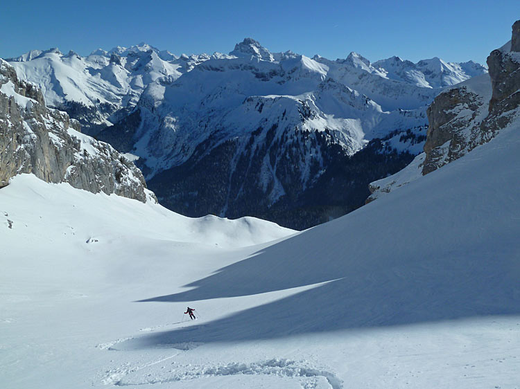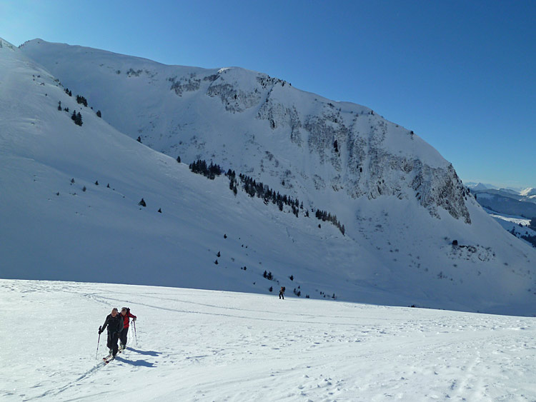 On se décide à une seconde montée pour suivre les traces du coté de la combe sauvage, on récupère les traceurs au col de Montarquis, et on profite de la combe jusqu'à la route du col de la Colombière.