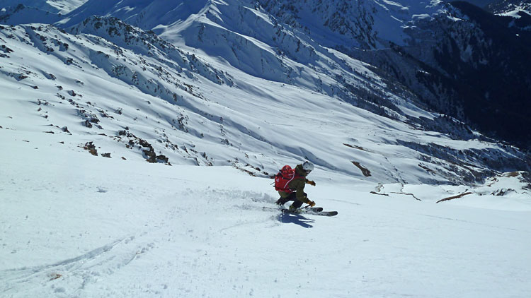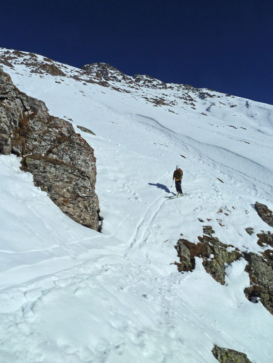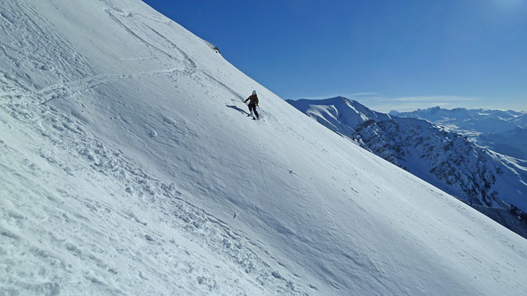 La traversée de 50 m pour prendre pied sur l'éuaule Ouest (vers 2400 m), légèrement plus froide avec une fine croute puis un mille-feuille à base de gobelets, nous a laissé un peu circonspects...