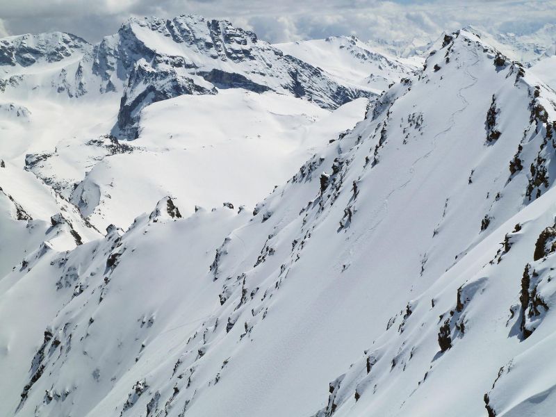 quelques bruits de tassement inquiétants en versants ensoleillés, signe que le manteau n'est pas complètement tassé et stabilisé. En versants froids, souvent une petite couche de fraiche posée sur une croute plus ou moins tendre, qui protège un manteau inférieur bien mou.