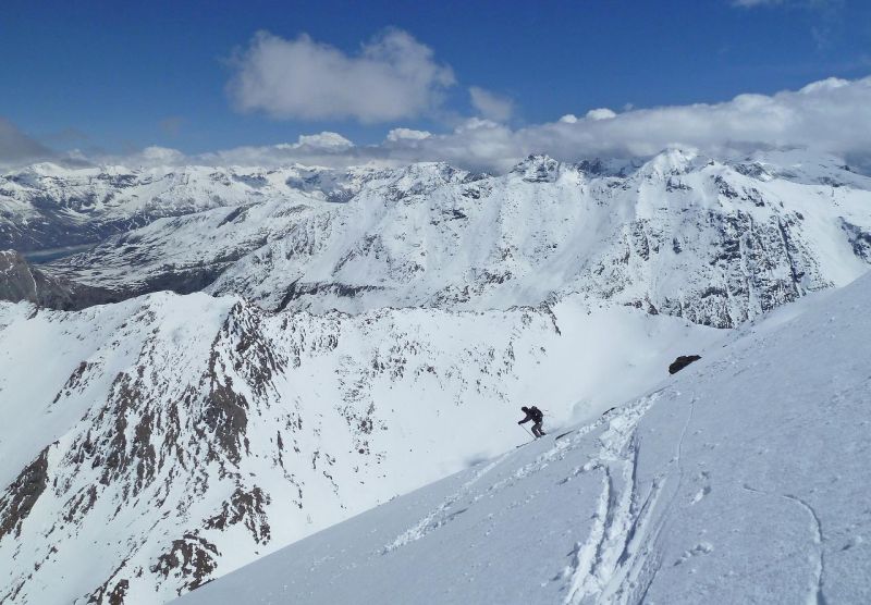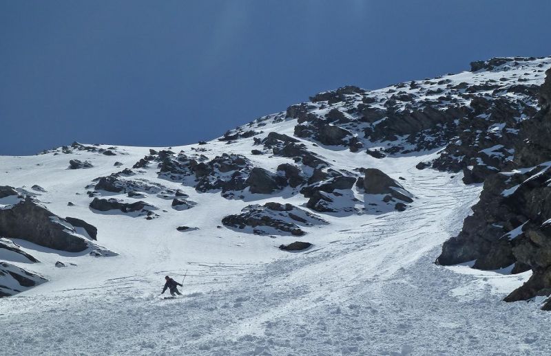 Une face de grande classe sur 650 m, parfois bien raide. Nos forfaits respectifs accomplis, retrouvailles pour une remontée à la pointe du Clôt où nous découvrons un joli couloir est et le moyen de revenir au parking skis aux pieds.