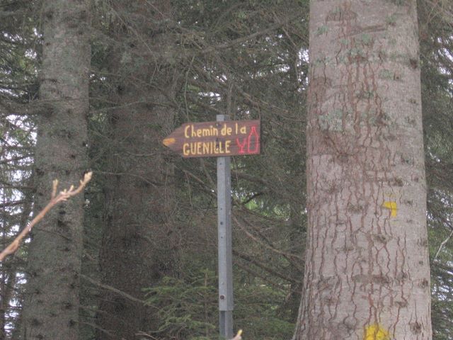 Chemin de la Guenille - (voir photo), je l'avais jamais vu celui là. Environ 800 m après les 2 épingles qui suivent le pont 1244, on prend la piste qui part à gauche. On la suit 750 m et dans le talweg, à droite toute. Il est la... et permet de rejoindre facilement le Chalet de Verneil. On n'a pas eu droit à la bibine annoncée !!. A noter que la piste jusqu'au terminus est ... secouante et parfois très grasse du fait des engins qui y ont circulé.
