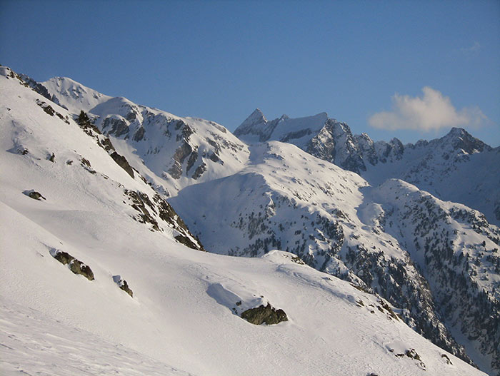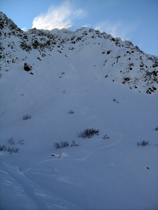 Au bout de 70 m environ, il faut tirer rive gauche pour prendre un petit couloir qui permet d'éviter un ressaut pas bien enneigé.
