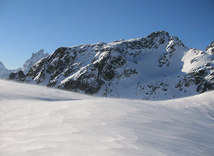 Dans le haut de la face un peu dégarnie, il y a de tout : un peu de neige légerement vitrifiée, de la poudre et surtout (comme la zone est sous le vent) de la neige qui commençait à se plaquer.