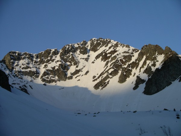 Partis pour faire un truc vite fait en allant chercher les croissants? Je me suis garé à 1300m, on peut monter jusqu'au terminus à 1336m. Du portage jusqu'à 1500m. Montée par le pas de la Coche et attaque du couloir par derrière rapide. Dommage qu'un prédécesseur ai descendu en escalier les 20 premiers mètres ! Sympathique couloir, mais un peu trop court. 80 voitures à Prabert à 9h !