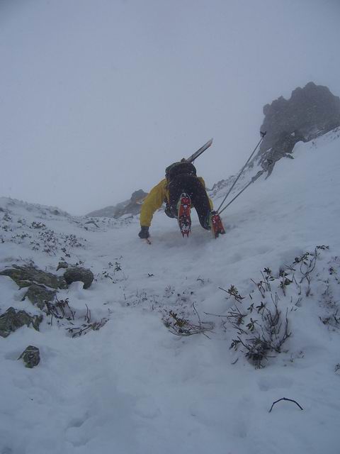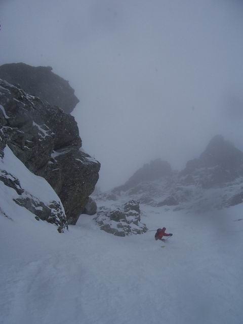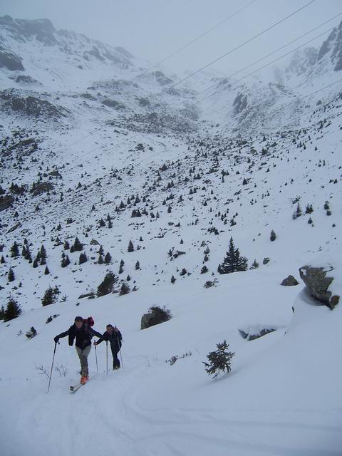 Le choix parmi les "pas encore coché-pas de portage-peu de bagnole" devient carrément restreint d'autant que le créneau était court. Finalement, les conditions étaient plutôt bonnes avec une visibilité correcte. Rencontre sympa au parking avec Yvon qui a du s'adapter à notre rhytme après avoir décidé de nous accompagner ! Ca skie sans problème jusqu'au parking, quelques blocs néanmoins dans la traversée pour rejoindre l'itinéraire du Venetier, qui lui ne fait pas vraiment envie