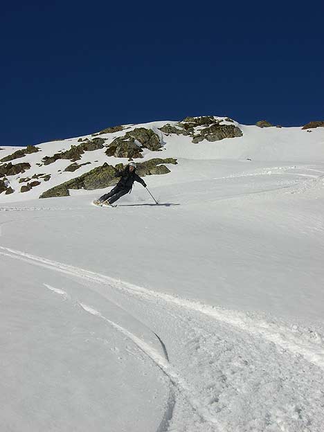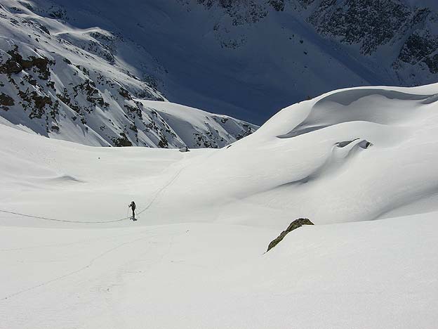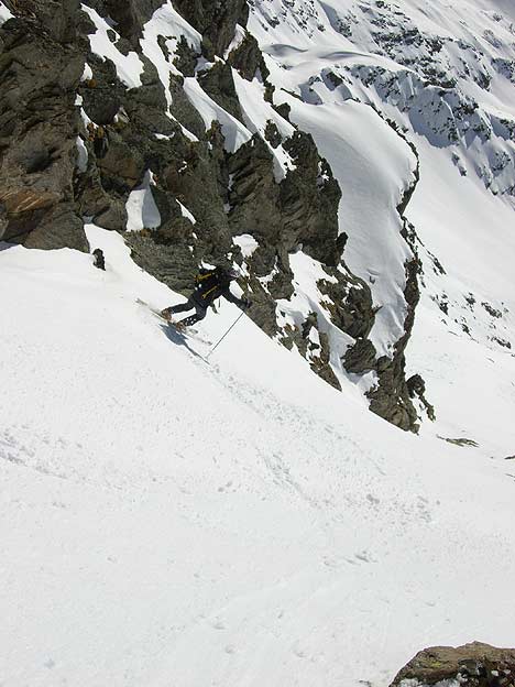 conditions printanières en versants sud à sud-ouest jusqu'à 3000 m. Faible dégel quand même > 2800. Quand on change à peine d'orientation, la neige est croûtée