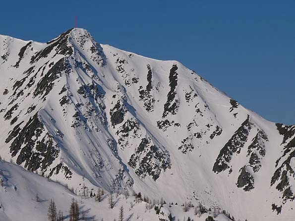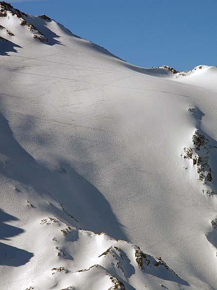 Un secteur bien fréquenté (si l'on en croit les traces parce qu'en ce jour de semaine, je n'ai vu personne jusqu'à 10 minutes de la voiture au retour) avec de belles classiques à découvrir. Pointe Ronde : j'ai fait un couloir à l'ouest du sommet qui était resté vierge. Prelayes. La classique nord était bien sûr tracée mais pas ce beau couloir nord-est qui me tendait les bras. Dans le bas des Prelayes classique, soit tirer à d pour rejoindre le sentier qui traverse le versant nord soit à g. par l'épaule mais pas comme moi entre les deux : fin raide et escarpée : sanglier-acrobranche-goulotté assuré.