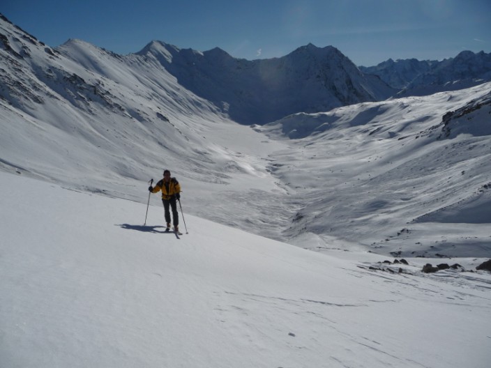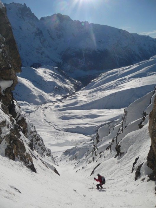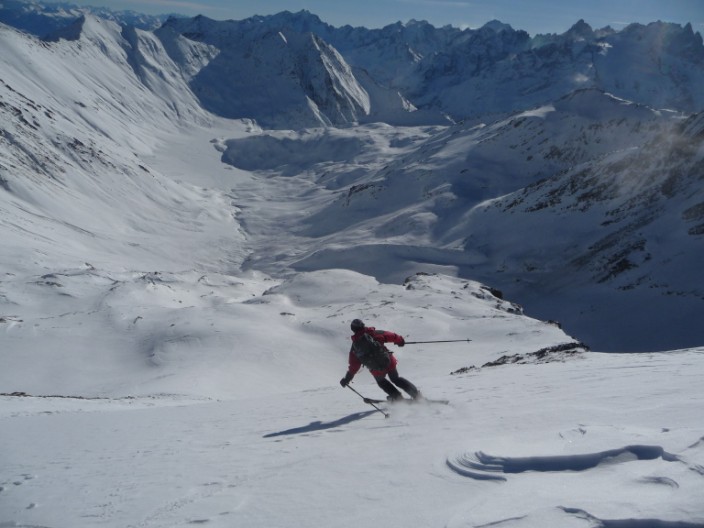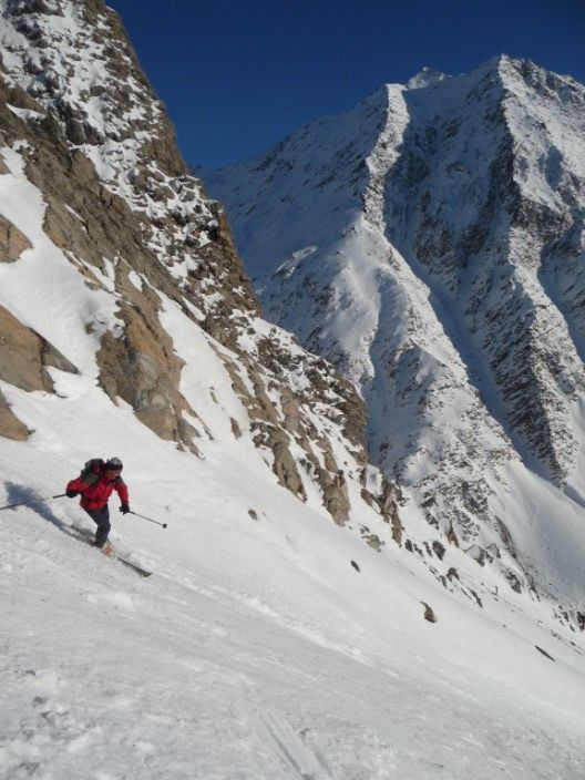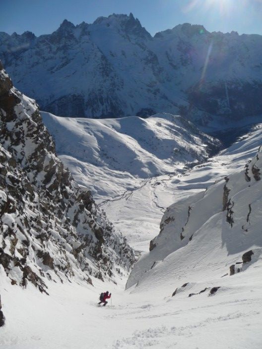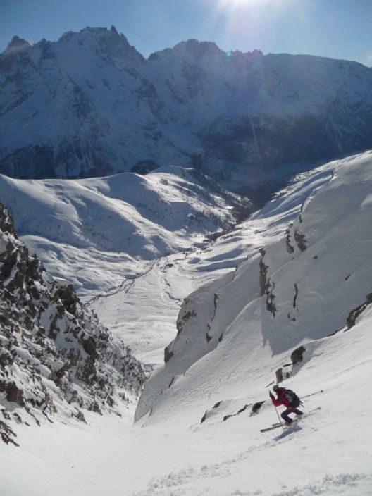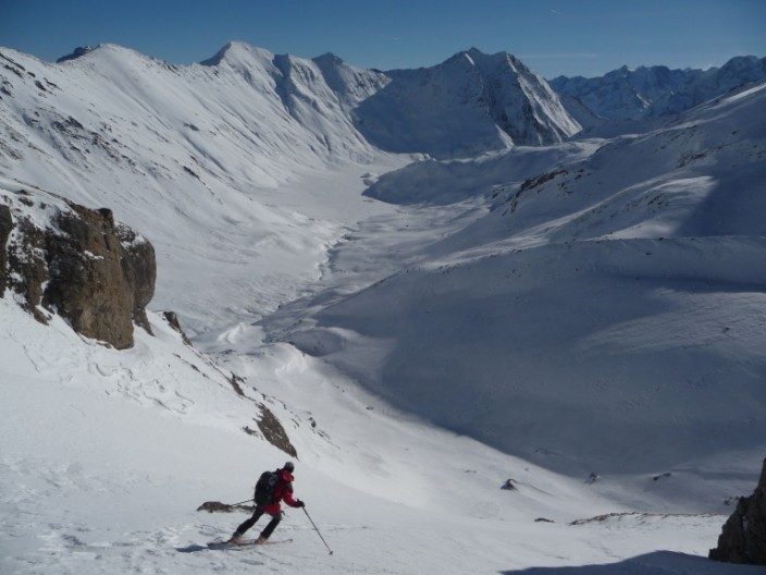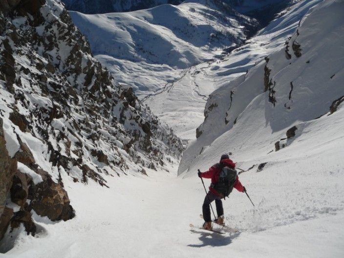 Pas mal de km pour aller visiter cette sauvage Pointe Salvador. Pente sud intéressante. Au retour, j'avais déjà repéré le couloir S de Roche de Casse en descandant le NW des 3 évêchés, c'était l'occasion d'y aller. Et quelle bonne surprise, 300m de pente bien raide dans le couloir et 400m de bonne pente en dessous. Le couloir est à saisir à cette époque, car aucune boule, plus tard en saison, il est souvent goulotté et plein de boule. Cot proposée 4.3/E2 ou + selon...