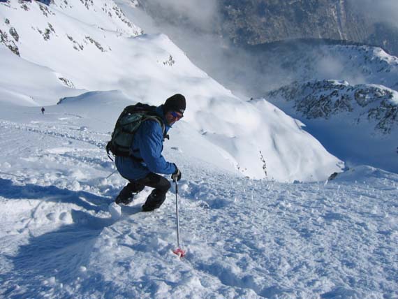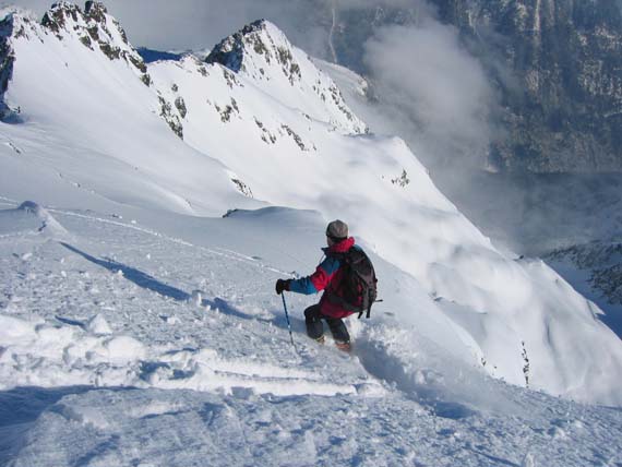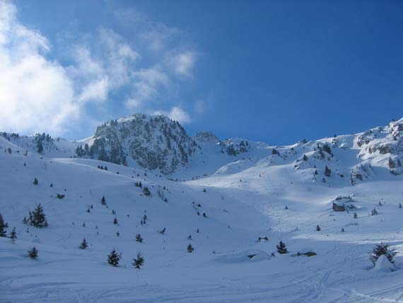 De la poudre de haut en bas. La petite variante au sommet permet d'accéder à la pointe Sud et non à la centrale Sud (moins courrue mais plus esthétique) à la descente Daniel à explosé sa chaussure sur un rocher qui affleurait sous la neige. Après un rafistolage dont il a le secret, il réussissait à regagner le bas sans encombre.Cot pour les 200 derniers mètres:4.1 /E2
