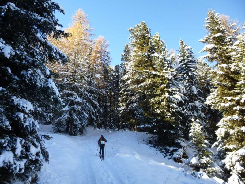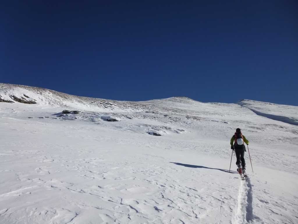 Moins de neige ici que côté français. Sur la route de Pila, il faut attendre 1200m pour voir un peu de neige sur le bord de la route. Au-dessus de la forêt (2300m) le vent et le soleil ont travaillé la neige.