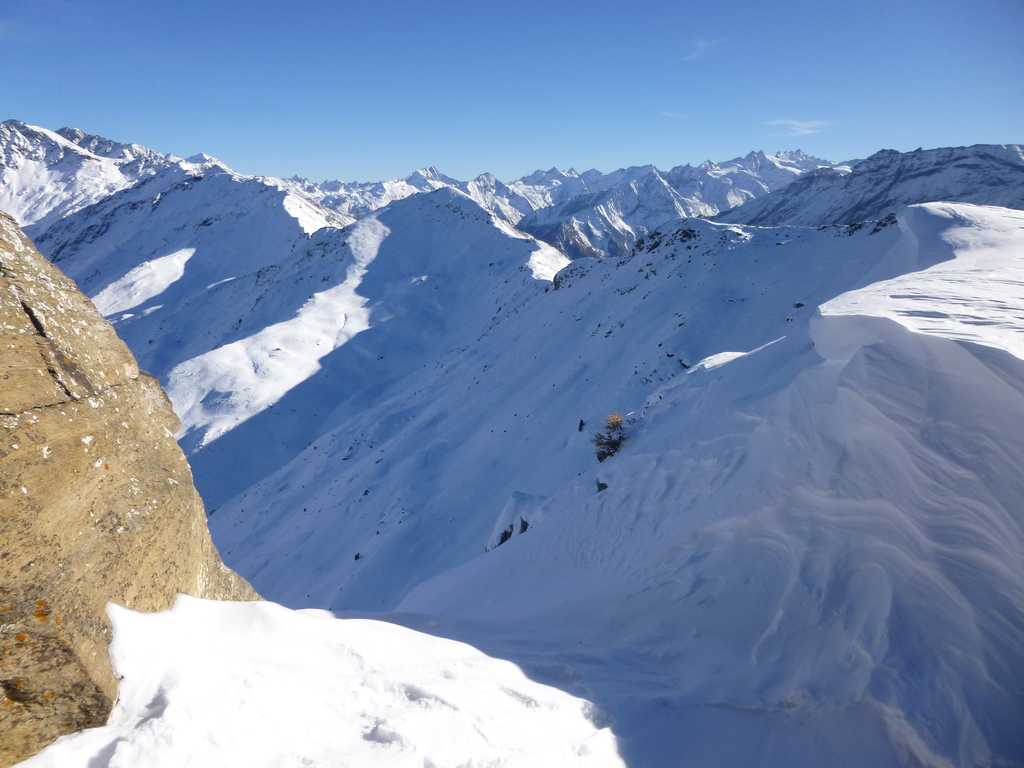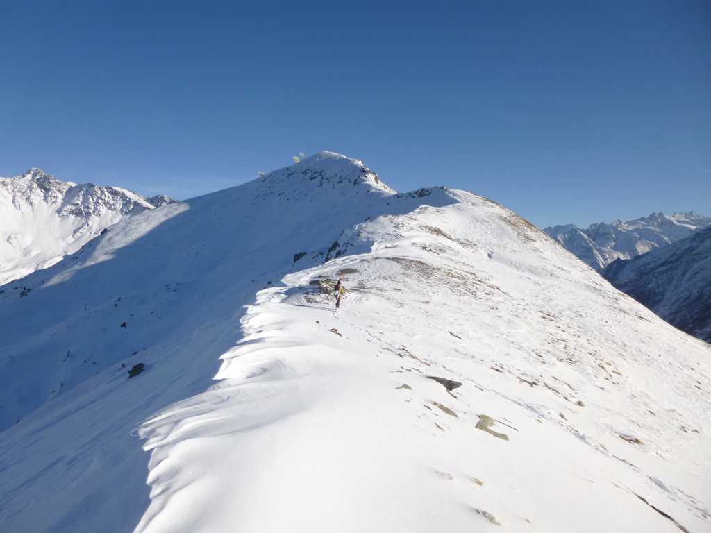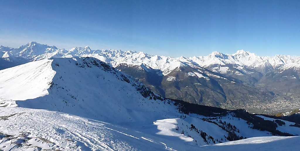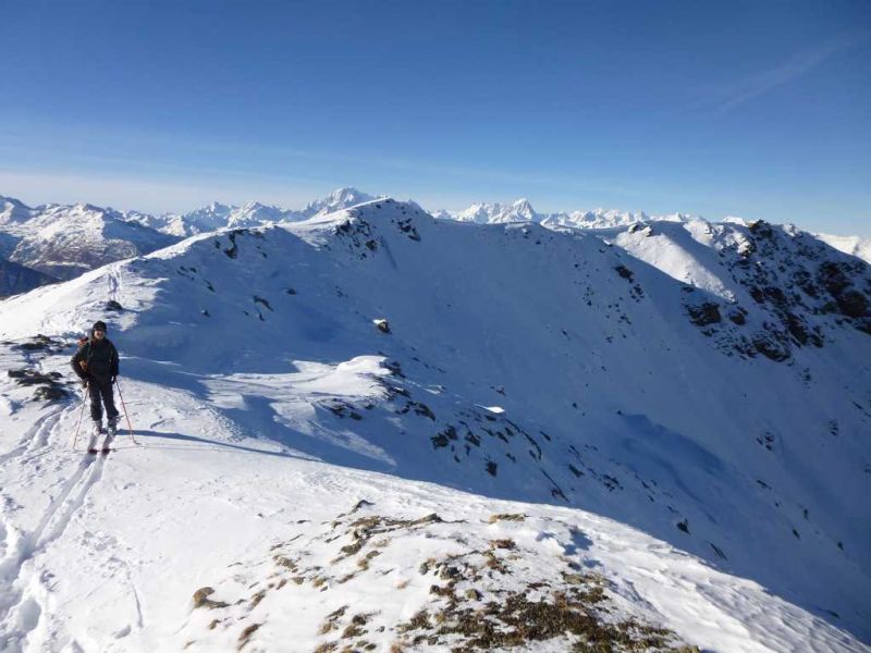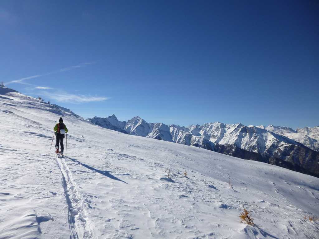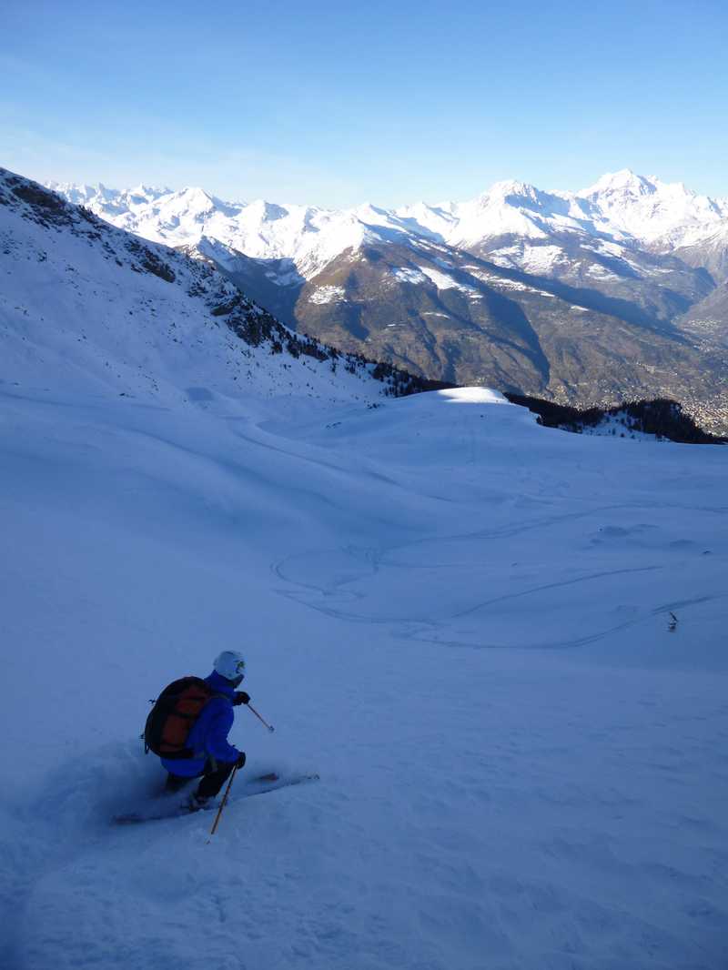 Comme le laissait supposer les webcam, il y a moins de neige dans le val d'Aoste qu'en Haute Savoie. La saison de ski de rando à Pila a quand même commencé avec une bonne cinquantaine de skieurs pour remonter les pistes de la station. Sur notre itinéraire, 3 personnes nous précédaient à une heure d'intervalle. Personne par l'itinéraire NO depuis Ozein (peu enneigé). La boucle par la pointe du Drinc était une bonne option aujourd'hui pour avoir une neige correcte (skis cailloux conseillés quand même).