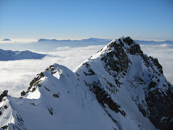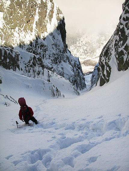 Le couloir oriental présentait une bonne couche de poudre : 50 cm avec un fond dur pour grosso-modo les 150m sommitaux (partie raide + " goulotte "), plus bas le mètre de poudre était atteint. Quelques faces planes au niveau rochers sommitaux, plus une belle accumulation dominant l?entrée (par le haut) du couloir oriental, que nous avons sagement évité en restant bien rive gauche au bord de l?arête. Le remplissage du couloir central est nettement meilleur que celui rencontré lors d?un premier " voyage " le 07 janvier dernier : l?étroiture où nous avions buté est totalement masquée.
