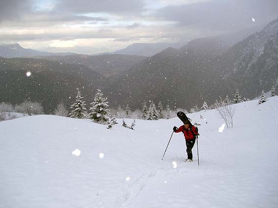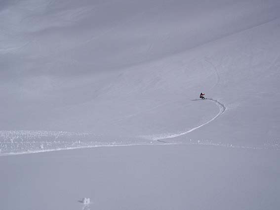enfin des températures de saison ce qui n'a pas encore changé la sous-couche pourrie <2000m. En revanche, la poudre est descendue jusque sous l'Oûle remettant à l'ordre du jour des paysages un peu hivernaux. Dans les pentes d'approche du couloir, nous avons noté que les 30cm sont tombés en deux fois et que les 15 supérieurs sont plus denses que les 15 de dessous, ce qui pourrait occasionner qq surprises. Nous avons prudemment remonté vers le couloir là où les pentes avaient déjà purgé. Le risque annoncé de 2 nous a semblé sous-estimé. Côté qualité de ski, c'est bon au-dessus de 2000, très correct entre 2000 et 1500 et bon en-dessous en suivant la piste dammée.