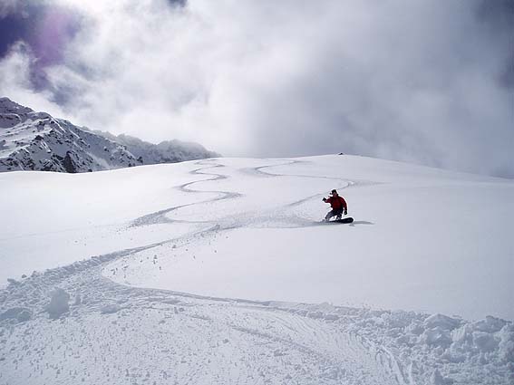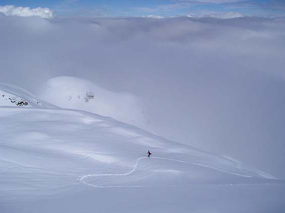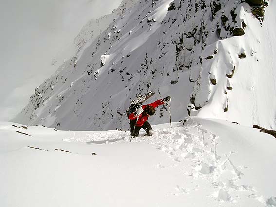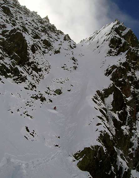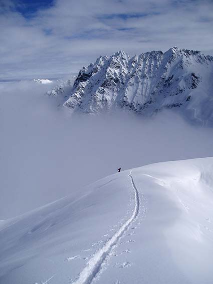 C'était pas gagné avec la météo mais au-dessus de l'Oûle, nous avons eu la surprise de passer à travers la couche. Le couloir est couenneux mais bien raide et étroit et ne se prête pas à une collective. Déjà skié par l'inusable jean Bouchet (JBO), c'est une variante de plus aux nombreuses pentes de la Porte de l'Eglise mais celle qui débouche le plus haut. Si quelqu'un trouve une raquette dans les pentes menant au couloir, emportée par nos purges de descente, elle est à JAD.