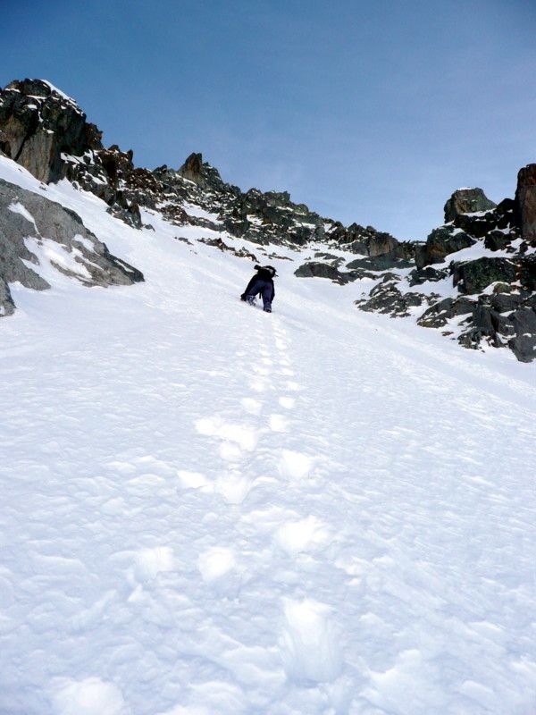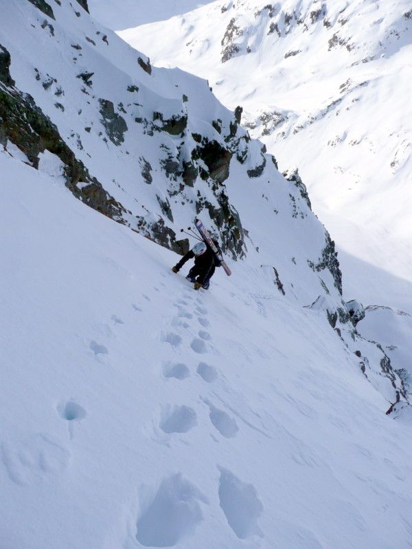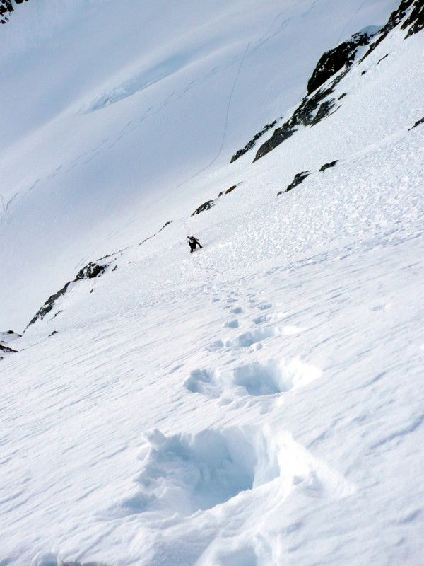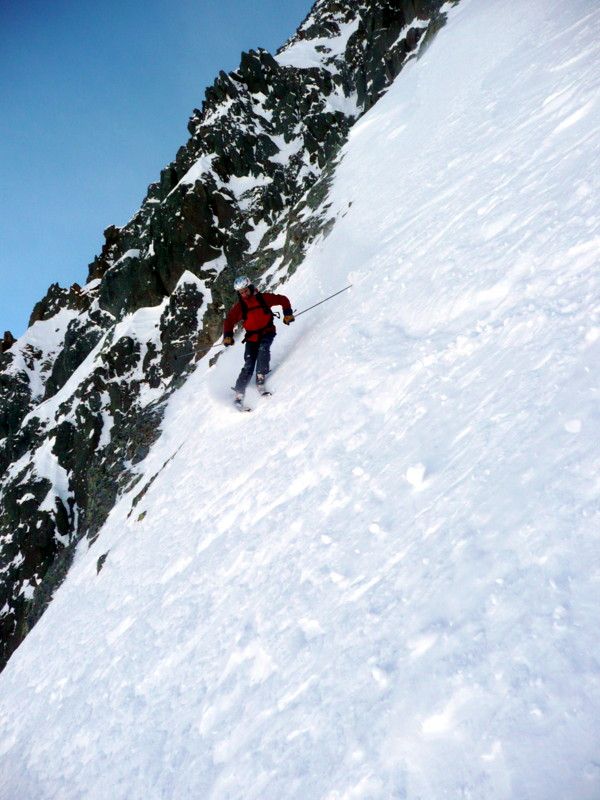 En altitude, le vent a travaillé la neige mais heureusement, en général, on évolue davantage vers du grain fin que du carton (sauf pour le couloir ouest d'accès où, au retour, la trace de remontée fut exténuante dans du carton).