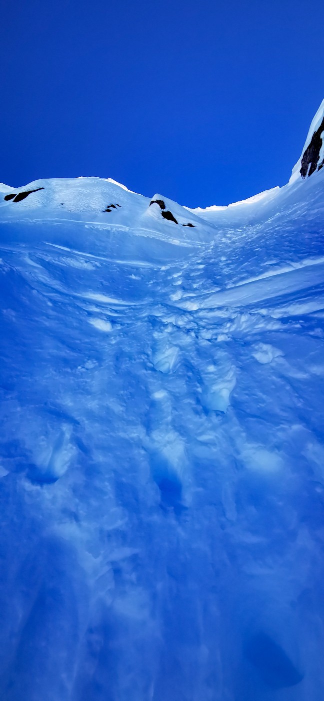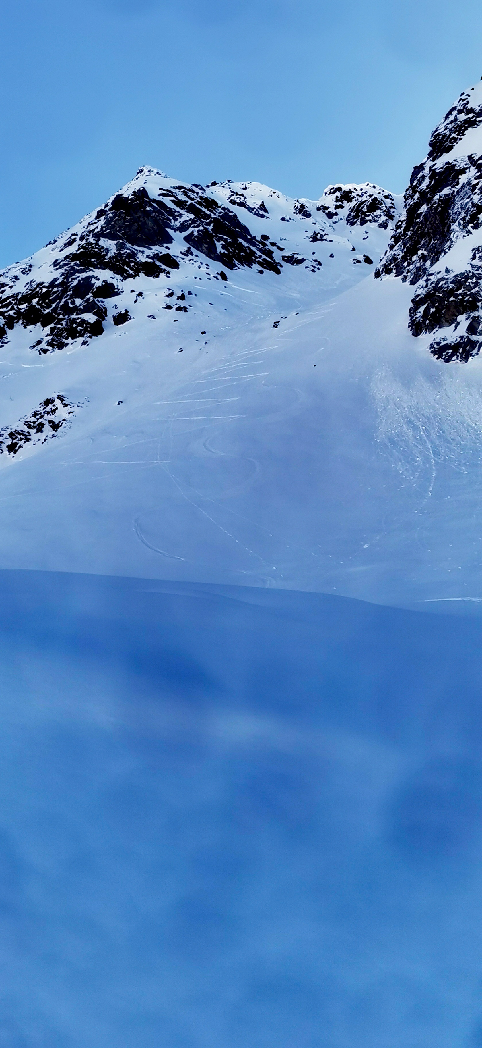 D'abord un grand merci à Denis Trento pour l'excellente trace de montée dans le couloir O de Pouegnenta, assez haut à ski puis les 80m pour sortir à pied.