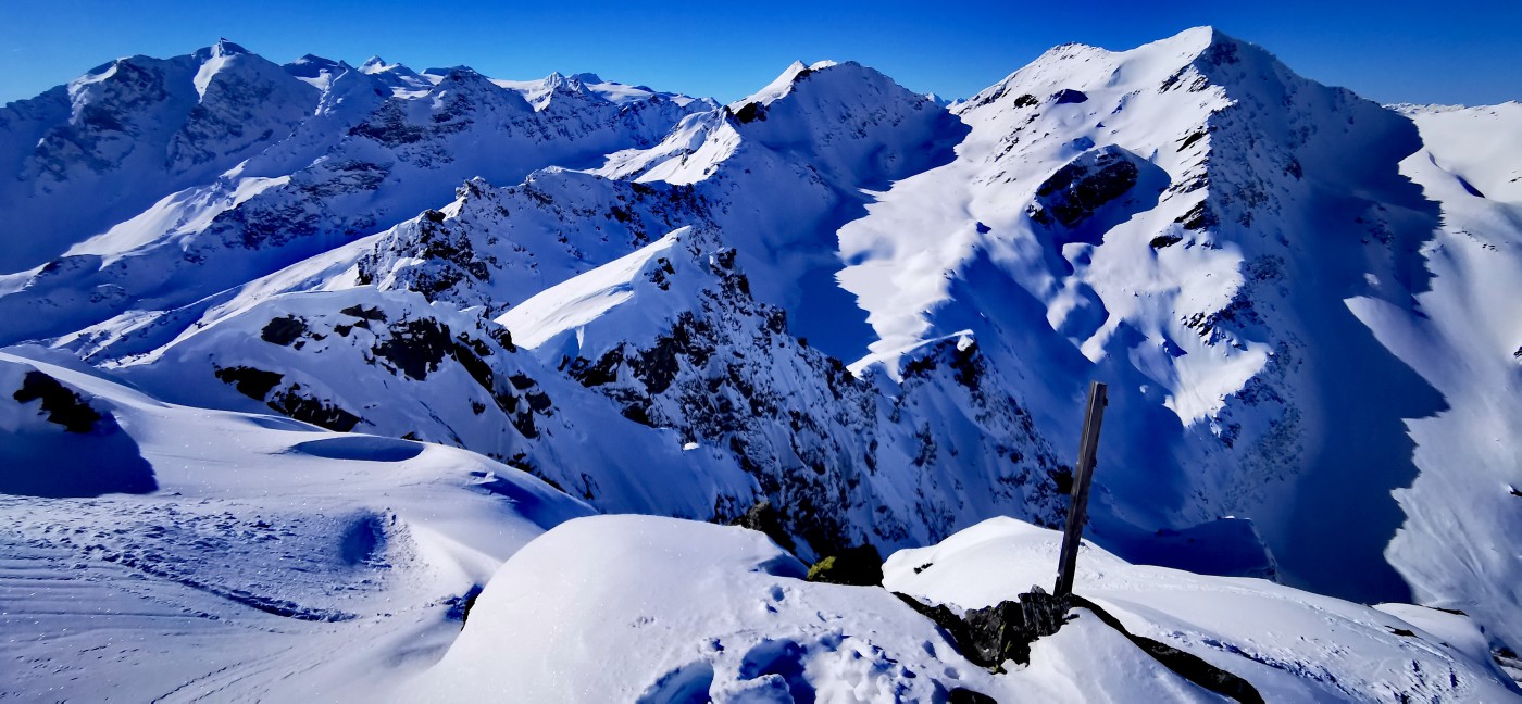 Sacrée mission pour tracer l'arête NO du Colmet, terrain caillouteux pas facile à lire quand il est recouvert de neige. Heureusement que je connaissais. Quelques pas de II en rocher à négocier, en chaussures de ski c'est toujours un peu plus compliqué!