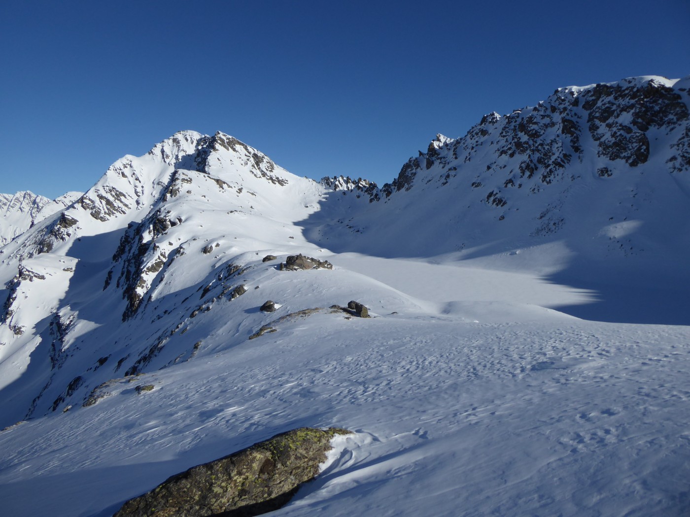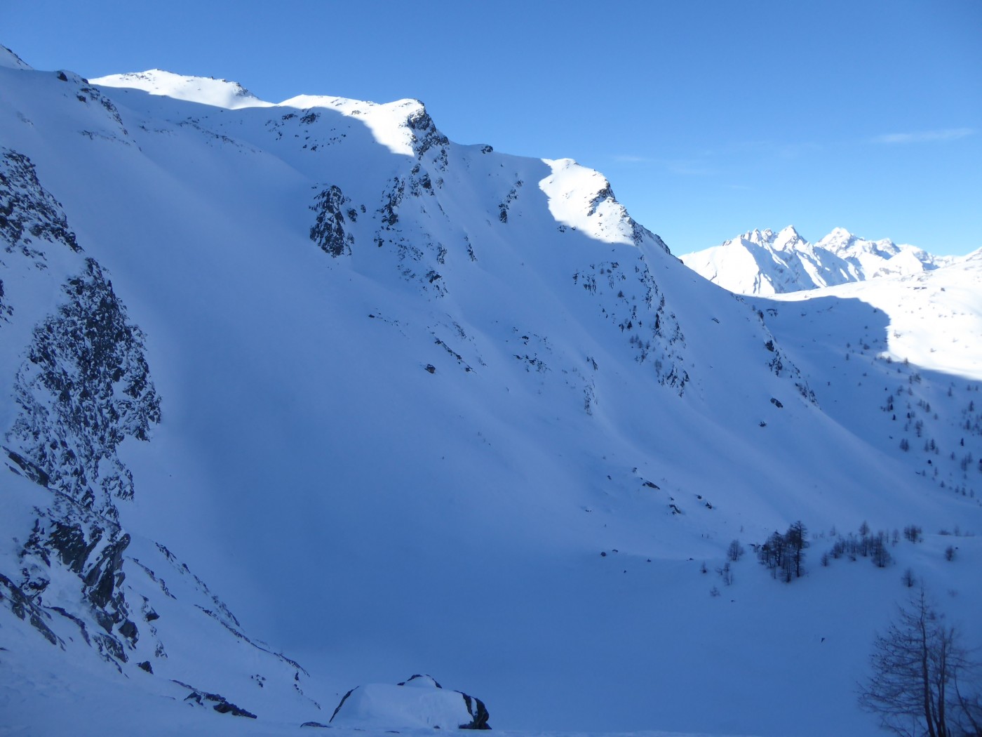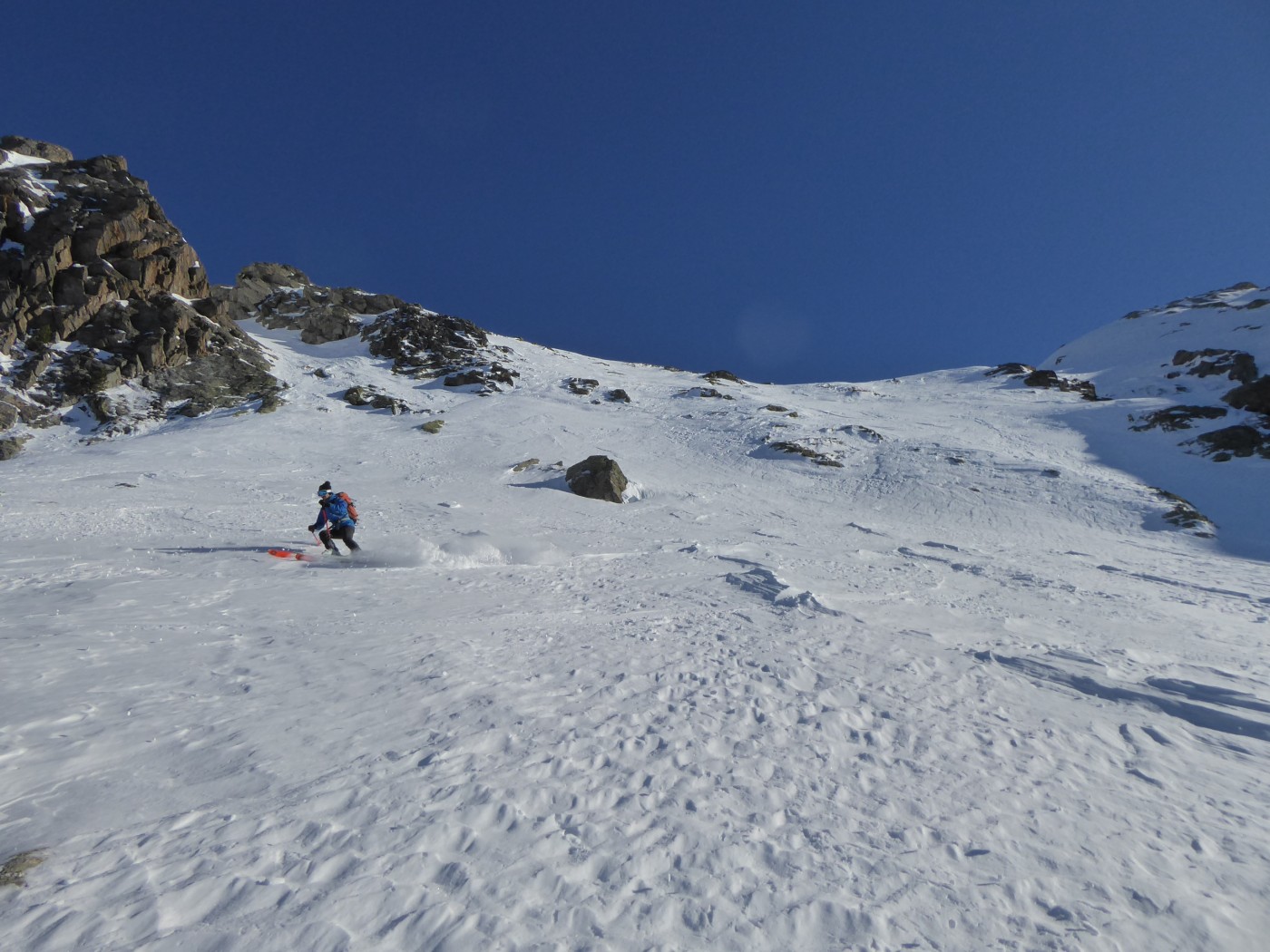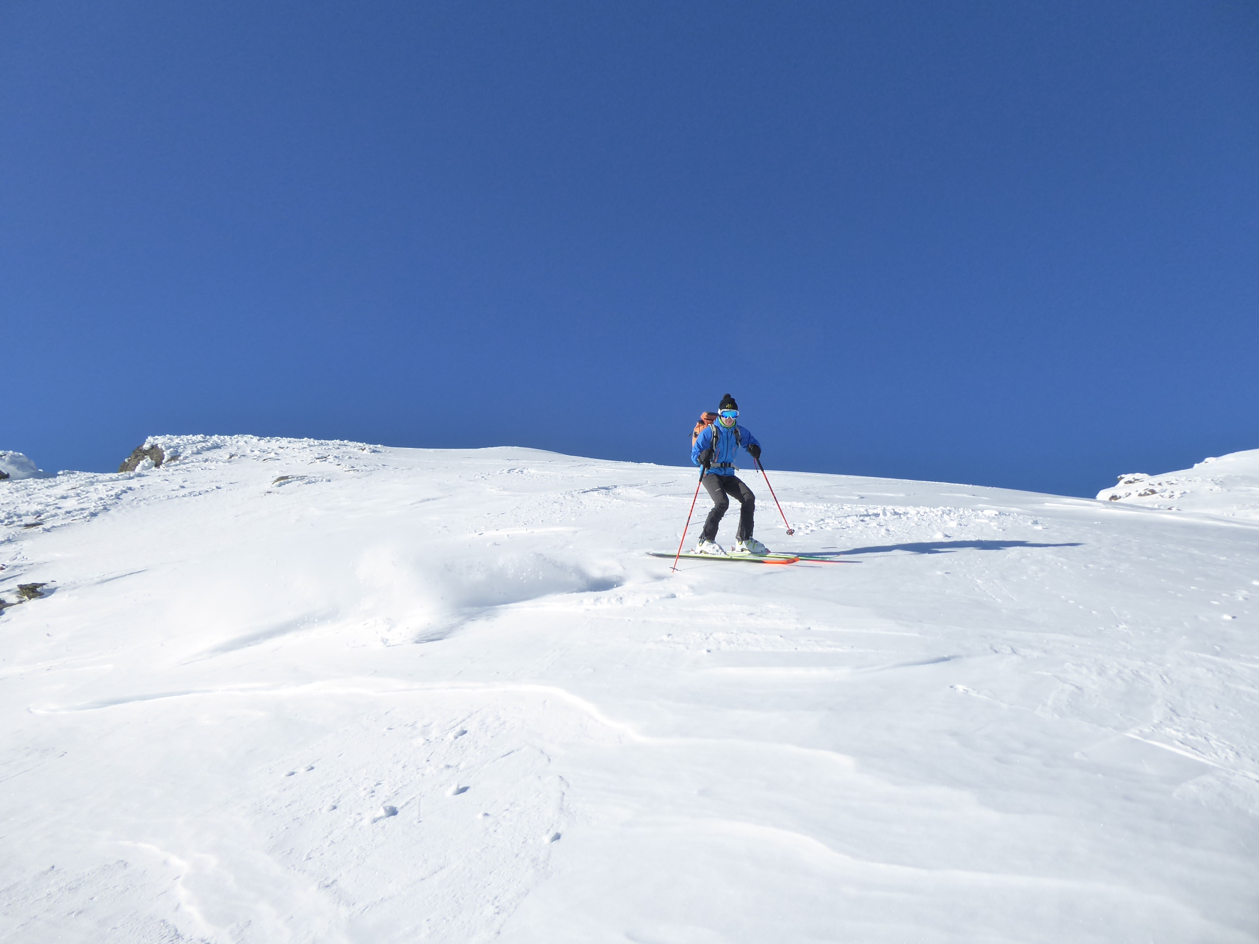 Le vent a du plus souffler ici que dans la vallée du Grand Saint Bernard où elle était poudreuse hier [https://www.volopress.net/sortie5835.html]. Ici elle est croutée sous 2000 et dure avec par endroit 5cm de poudre transportée par le vent. Bonne impression de stabilité dans les pentes parcourues. BRA à 3.