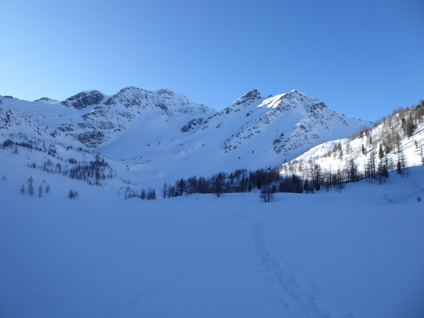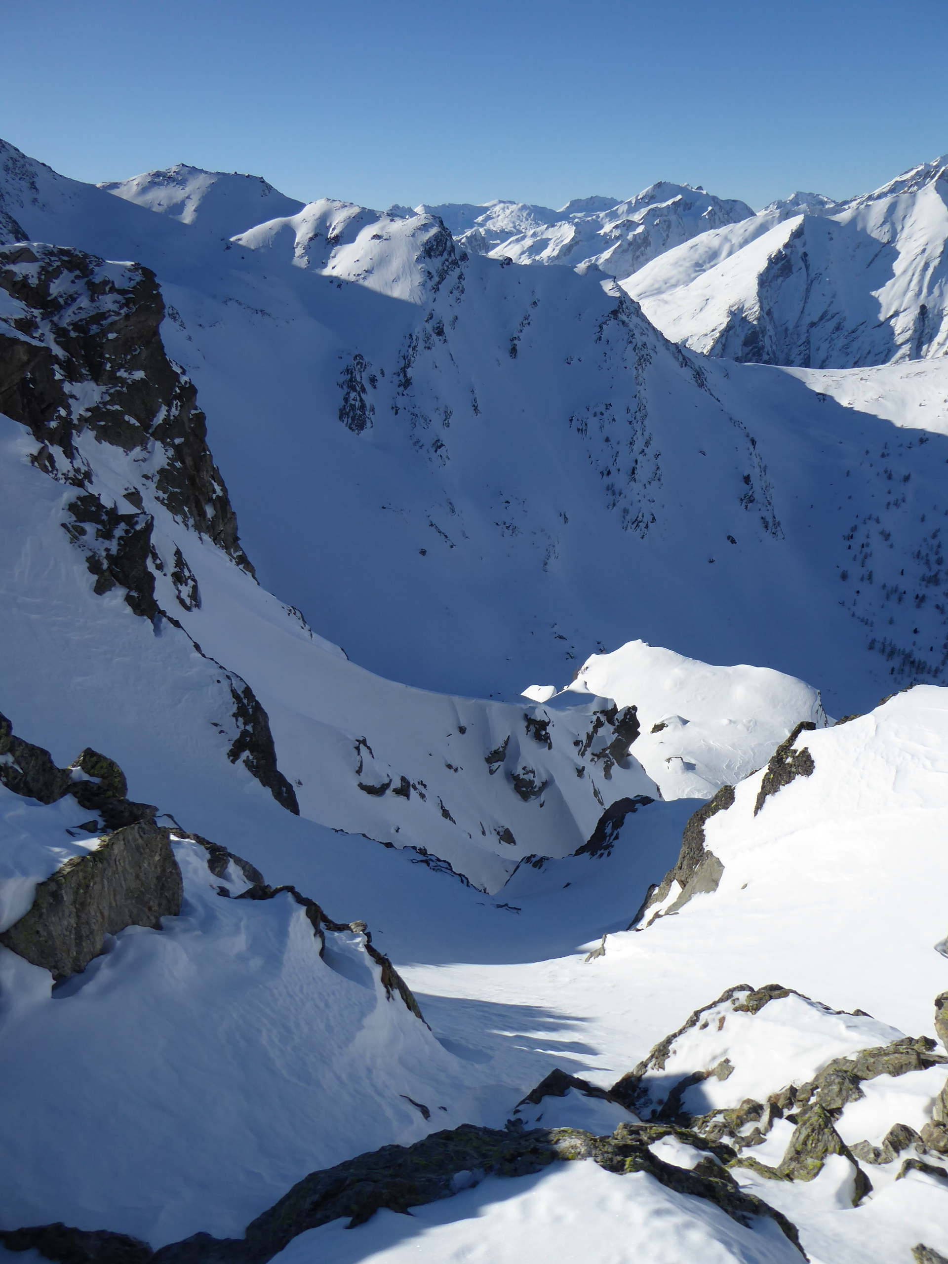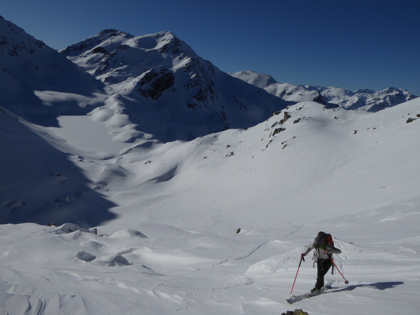 Le vent a du plus souffler ici que dans la vallée du Grand Saint Bernard où elle était poudreuse hier [https://www.volopress.net/sortie5835.html]. Ici elle est croutée sous 2000 et dure avec par endroit 5cm de poudre transportée par le vent. Bonne impression de stabilité dans les pentes parcourues. BRA à 3.