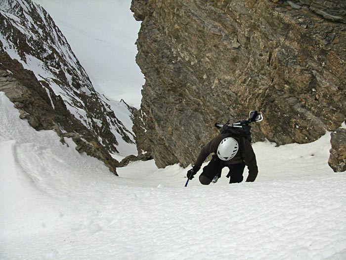 Le couloir est bien encaissé dans la paroi et doit être fortement exposé au chutes de pierres par temps très chaud. Ce jour ça parpinait pas trop mais quelques petites assiettes sont descendues.
