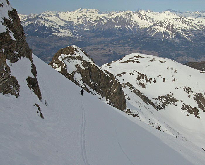 Des Gendres au dessus de Crots) : Montée jusqu'au pied de la combe nord de la Montagnette puis remontée d'un couloir/brèche encaissé (entre Pic du Lauzet et Pouzenc) orienté plein sud jusqu'à sa sortie 200 m sous le sommet du Pouzenc>> fin par le couloir nord> en A/R