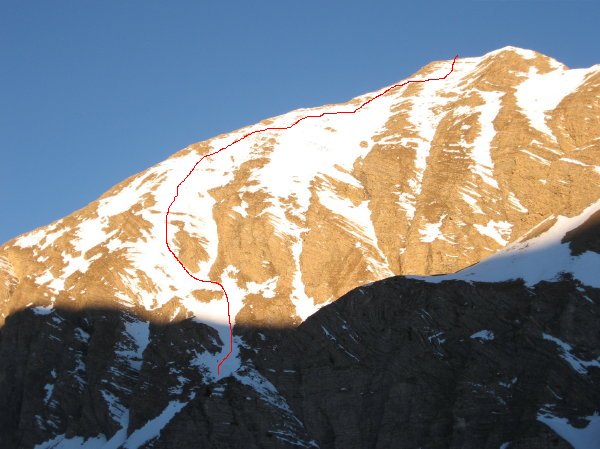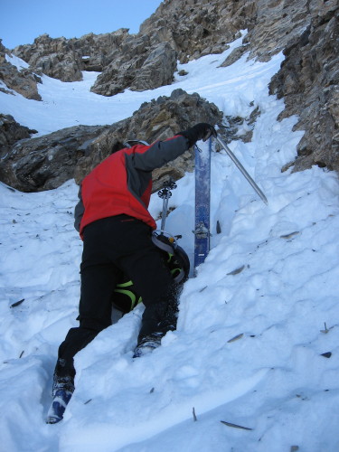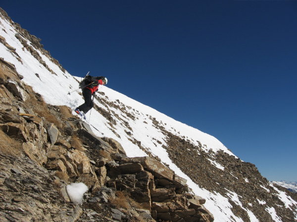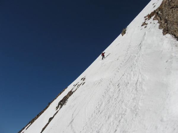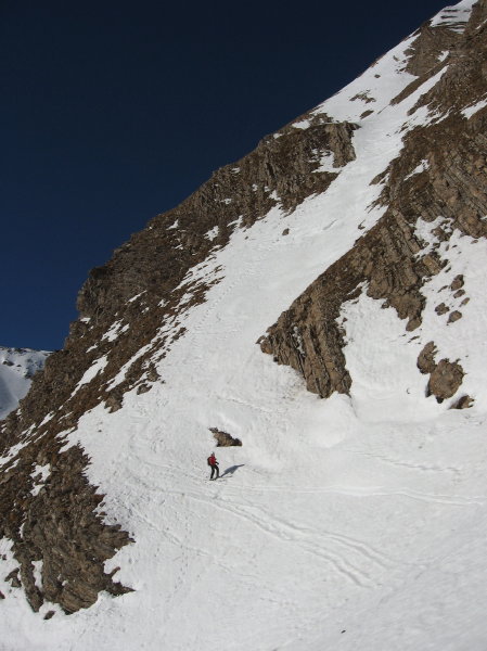 Face E à point à 9h40, trace à pied irrégulière mais portante la plupart du temps, remonter la face 1h plus tôt eut été plus confortable. Face un peu sèche mais en zigzaguant on part directement du sommet, rochers proches.