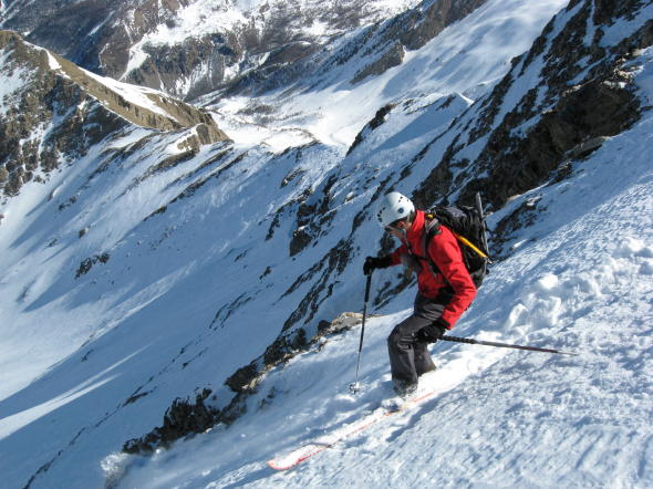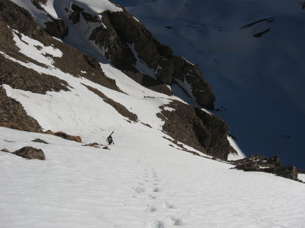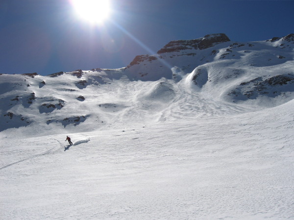 Face N: couloir sommital en gobelets sur rochers affleurants, court déchaussage après la traversée. Puis après un début en neige froide portante ou cartonnée on finit par de la poudre tassée réchauffée par le soleil: un pur bonheur dans ce vallon vierge et magnifique.