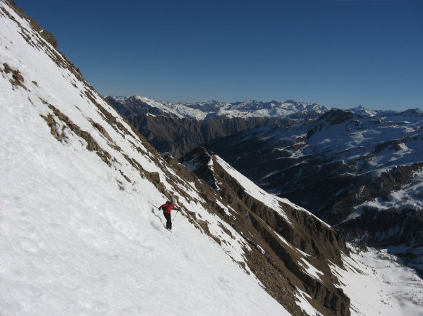 Après être allé voir le maigre enneigement vers Maljasset on revient venger le but de la veille avec ce superbe circuit conseillé par LTA. Conditions excellentes dans la face E malgré le faible regel (il ne fallait pas descendre 1/2 h plus tard sous peine de se retrouver dans de la pourrie jusqu'au sol). Arête sud panoramique et impressionnante du bas (40-45° en strates de rochers +/- sain) mais l'escalator naturel permet une progression aisée. Début de la face N bien raide, étroit et exposé dans le Z sommital, puis gros plaisir dans la belle face N (qui nous faisait de l'oeil depuis quelques années déjà depuis la route nationale) et le vallon sauvage de siguret. Il vaut mieux éviter cette face large par conditions nivo douteuses vu sa capacité à receler des plaques à vent.