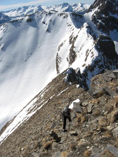 Remontée au sommet par la superbe arête sud, à pied dans les strates de rochers horizontales, cairns et peinture rouge pour faciliter le cheminement à suivre. Descente de la face N puis du très beau vallon de Siguret pour rejoindre les pistes de fond et faire un peu de skating pour le retour. D+/D-: 2000