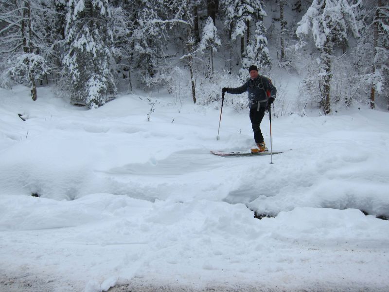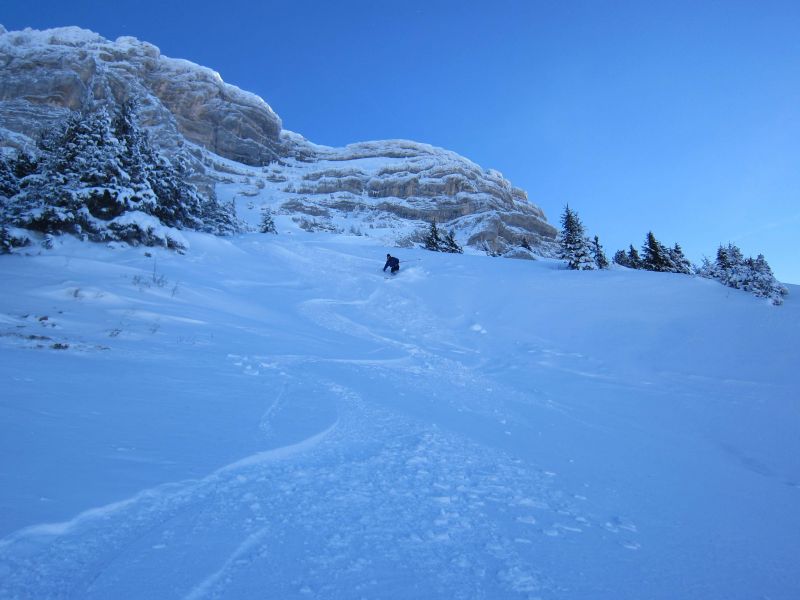 Enfin une quantité suffisante pour bien skier. A part la prairie de la Dt de Crolles que nous avons tracé (vent bien sensible) tout le reste était déjà bien tracé. La chute de neige de lundi (10/15 cm seulement) n'a pas recouvert les anciennes traces... Perquelin : entre 1100 et 940 il faut skier doucement pour anticiper les obstacles.