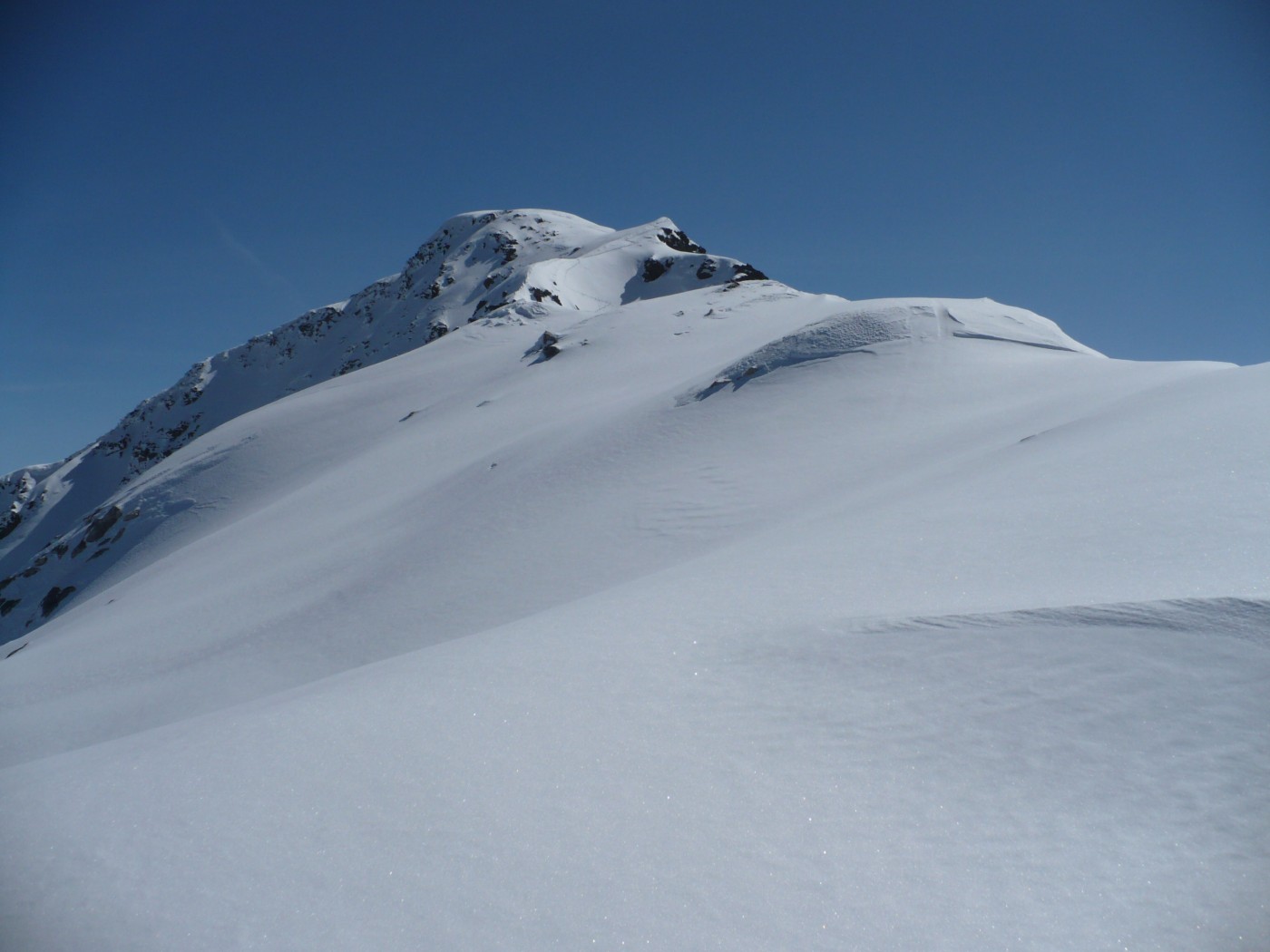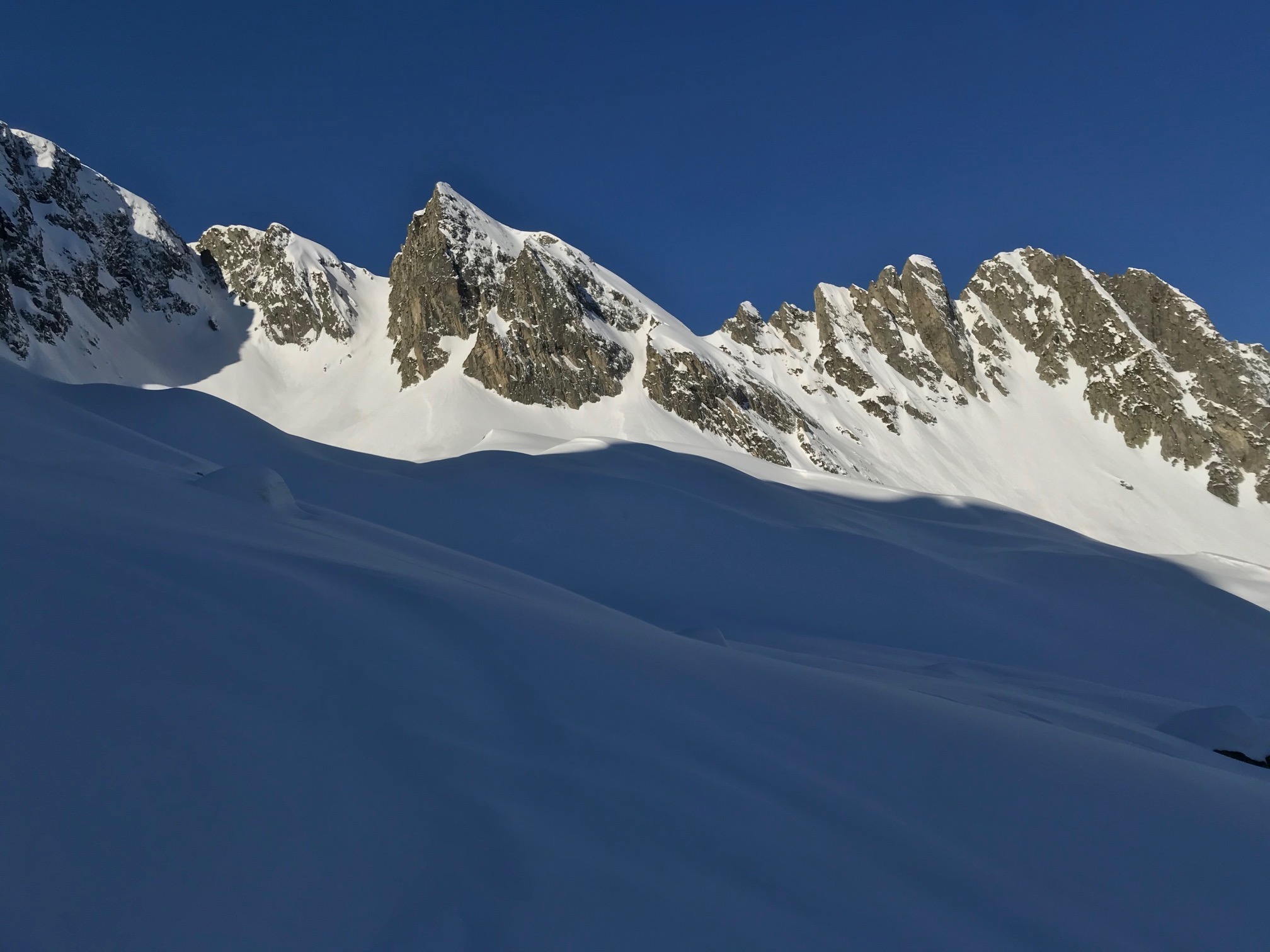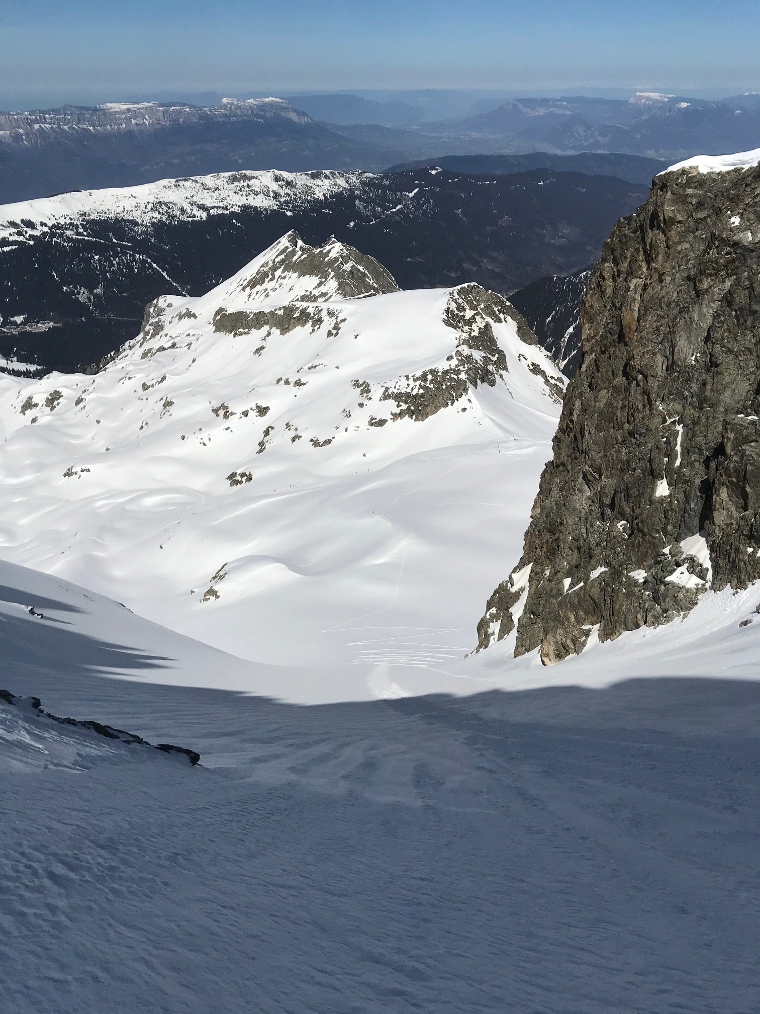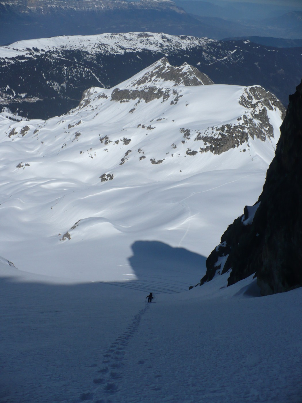 Repéré la semaine dernière, ce couloir nord/ouest méritait d’être visité, d’autant plus, que les récentes chutes de neige de cette semaine l’ont rendu en bonnes conditions aujourd’hui. Large à sa base, le couloir se rétrécit sur la fin (passage à 40°), puis petit ressaut à 45°, avant de sortir sur l’arête. On a continué jusqu’au point 2866 m, ensuite, c’est plus compliqué avec des désescalades exposées près des corniches. Départ à skis sur l’arête large, puis on plonge dans le couloir où nous sommes accompagnés de quelques coulées de surface. Passé le rétrécissement, on peut se lâcher plus facilement. Neige légère à skier jusqu’à l’alt 2300 m, puis 300 m de croûtasse revenue, et boarder cross ludique dans la forêt jusqu’à la dernière clairière.