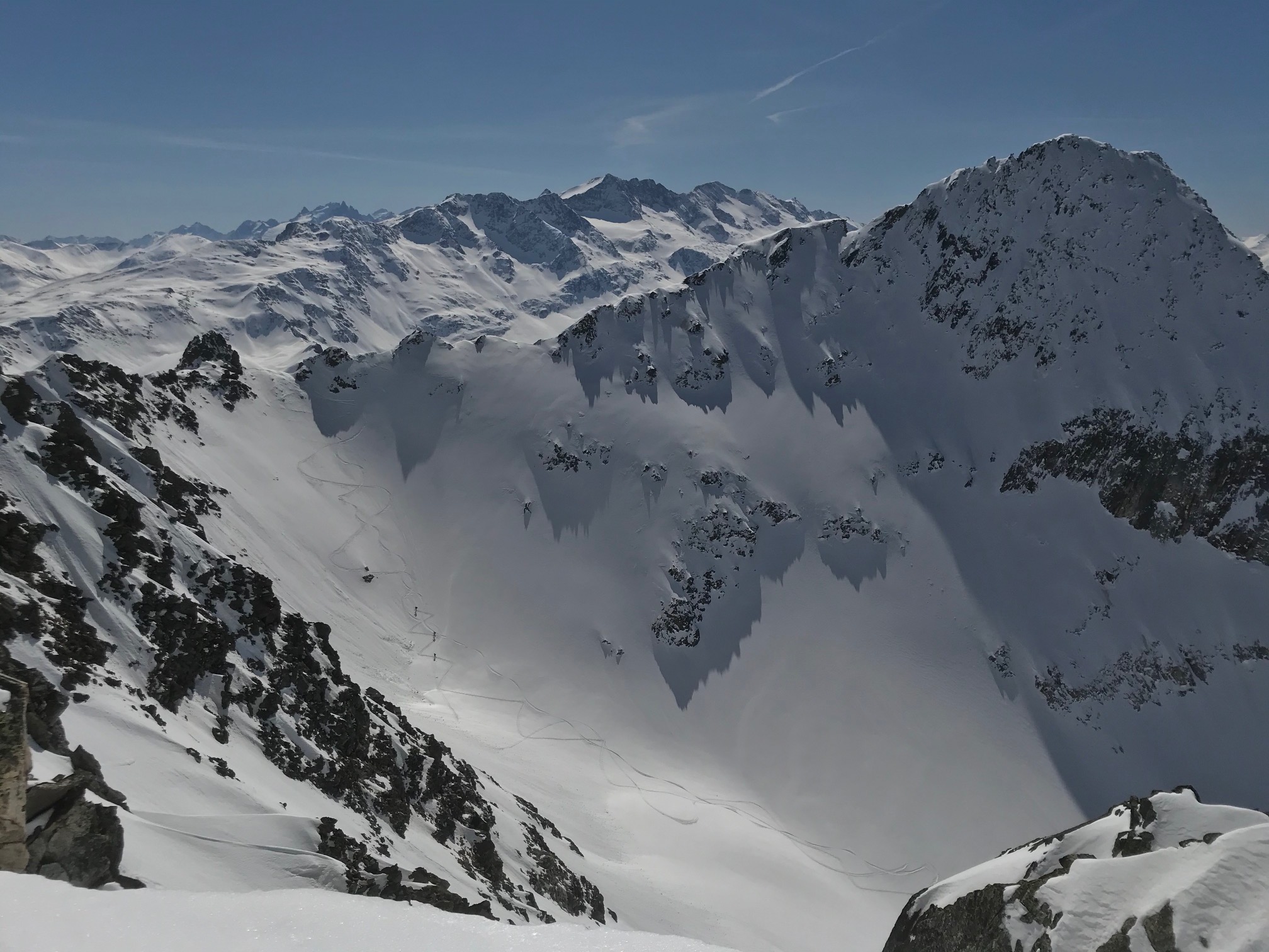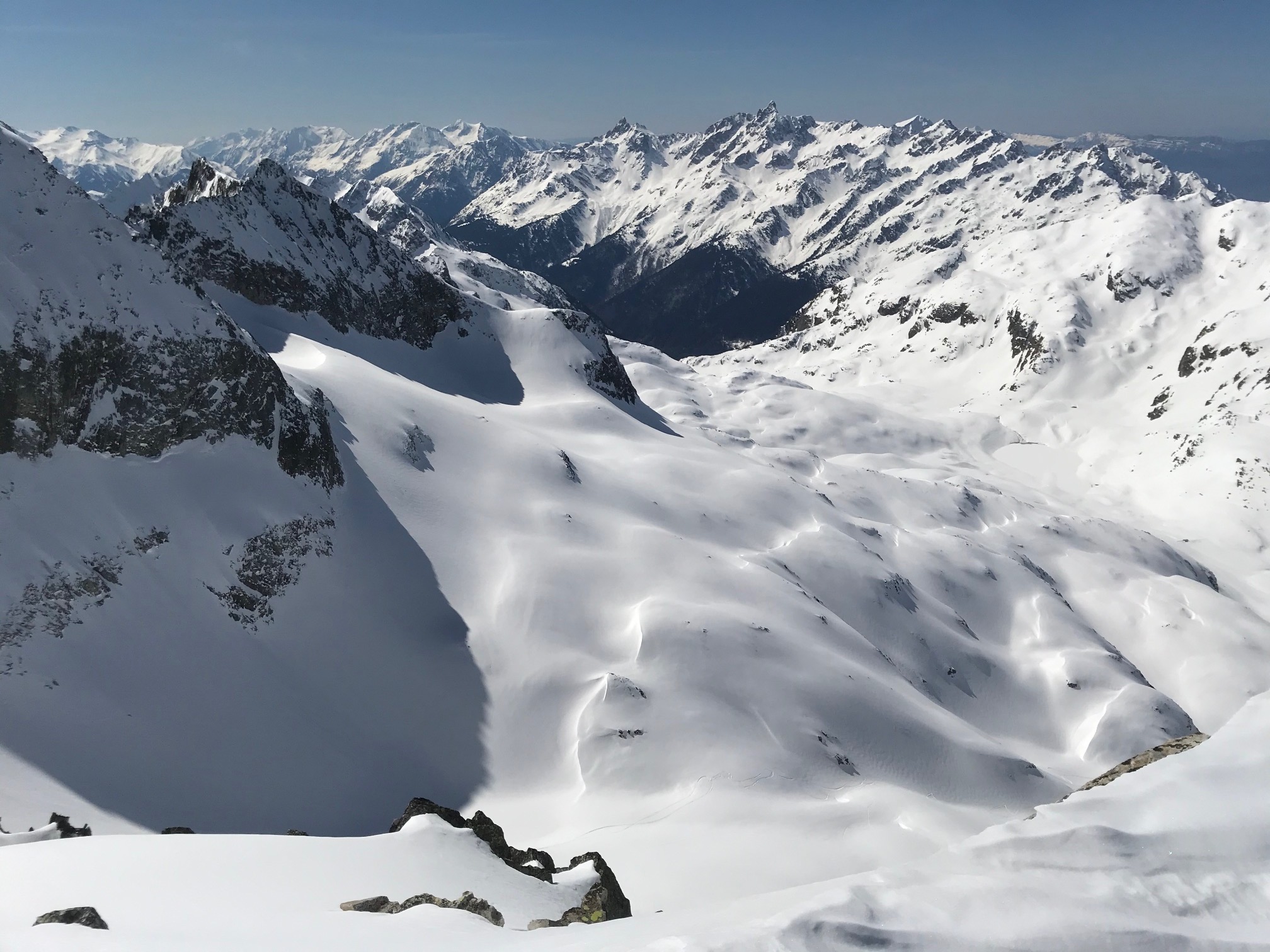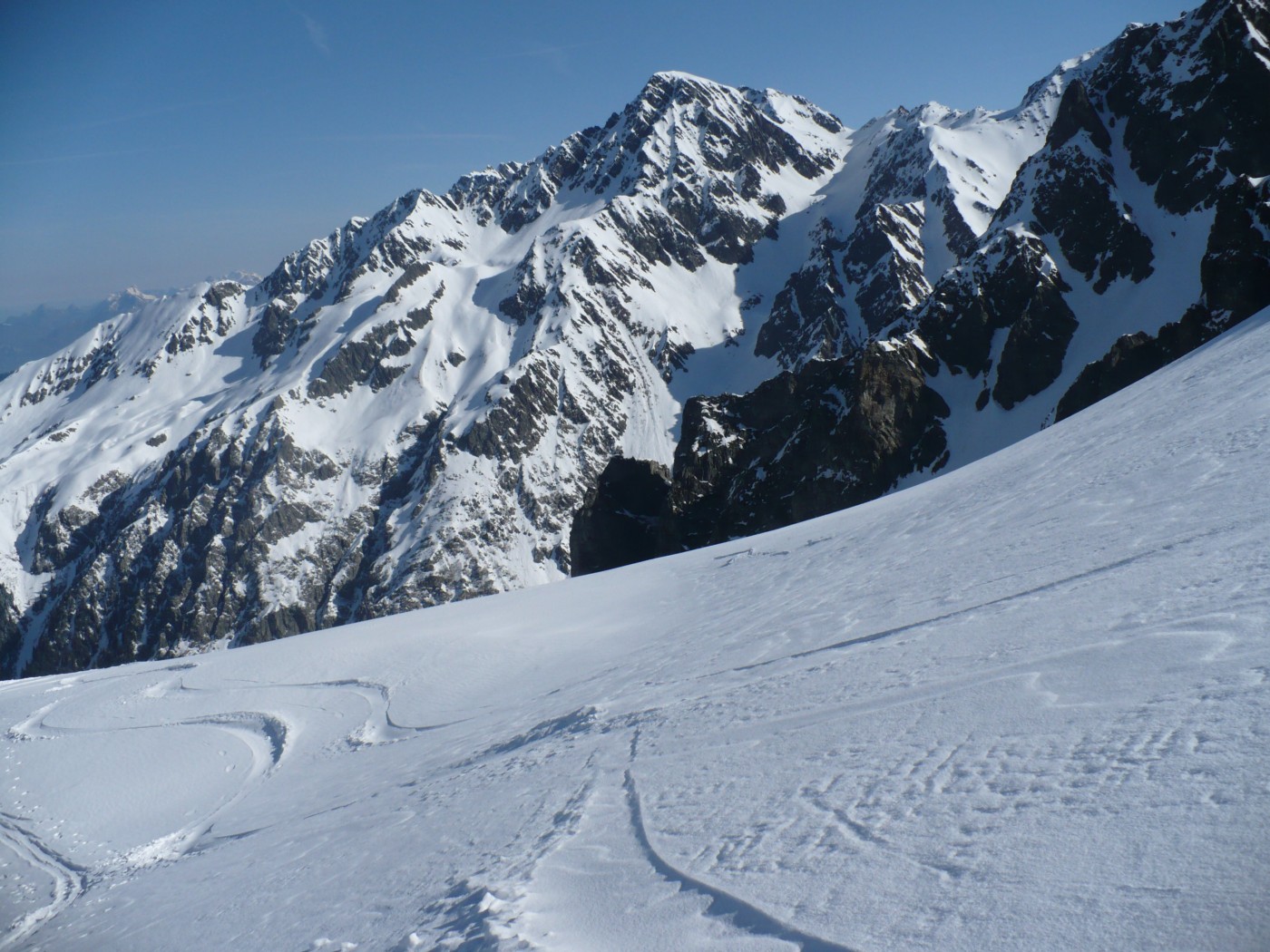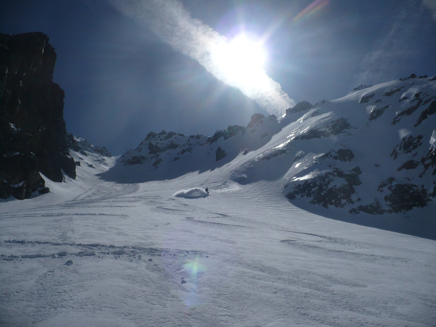Repéré la semaine dernière, ce couloir nord/ouest méritait d’être visité, d’autant plus, que les récentes chutes de neige de cette semaine l’ont rendu en bonnes conditions aujourd’hui. Large à sa base, le couloir se rétrécit sur la fin (passage à 40°), puis petit ressaut à 45°, avant de sortir sur l’arête. On a continué jusqu’au point 2866 m, ensuite, c’est plus compliqué avec des désescalades exposées près des corniches. Départ à skis sur l’arête large, puis on plonge dans le couloir où nous sommes accompagnés de quelques coulées de surface. Passé le rétrécissement, on peut se lâcher plus facilement. Neige légère à skier jusqu’à l’alt 2300 m, puis 300 m de croûtasse revenue, et boarder cross ludique dans la forêt jusqu’à la dernière clairière.