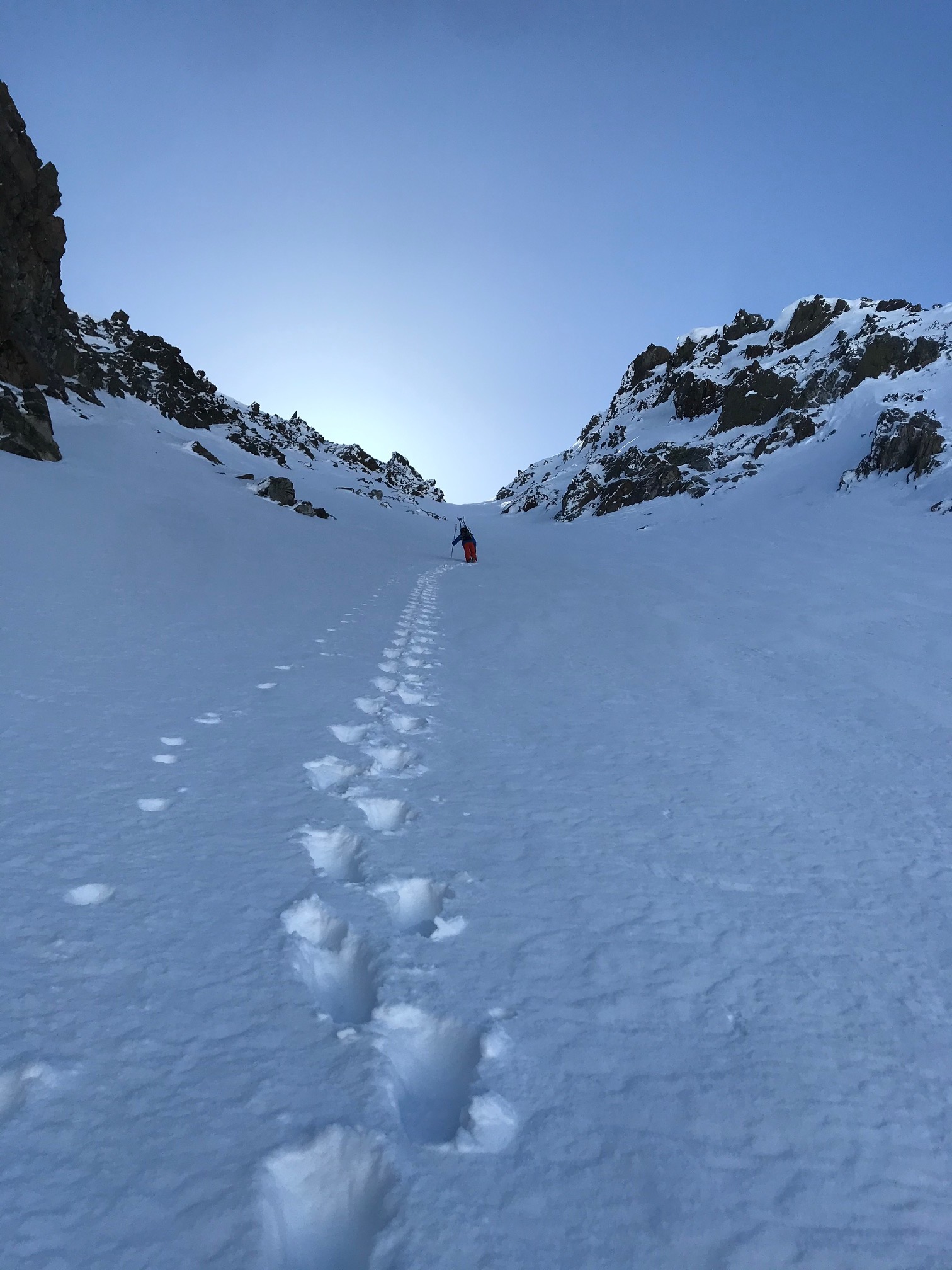 On chausse à 1400 m dans la 1ère clairière ; dans la combe du col de Mouchillon, la neige est dure, puis croûtasse de 2100 m à 2400, et grains fin jusqu’au col. Au pied du couloir, 40 cm de neige roulée, au milieu rive droite, 5-10 cm de grains fin avec un fond sain, sous l’étroiture, 40-60 cm de neige meuble avec un fond moins sain, au niveau du ressaut rive gauche, à nouveau fond sain, et la sortie sur l’arête est en neige dure-verglacée.
