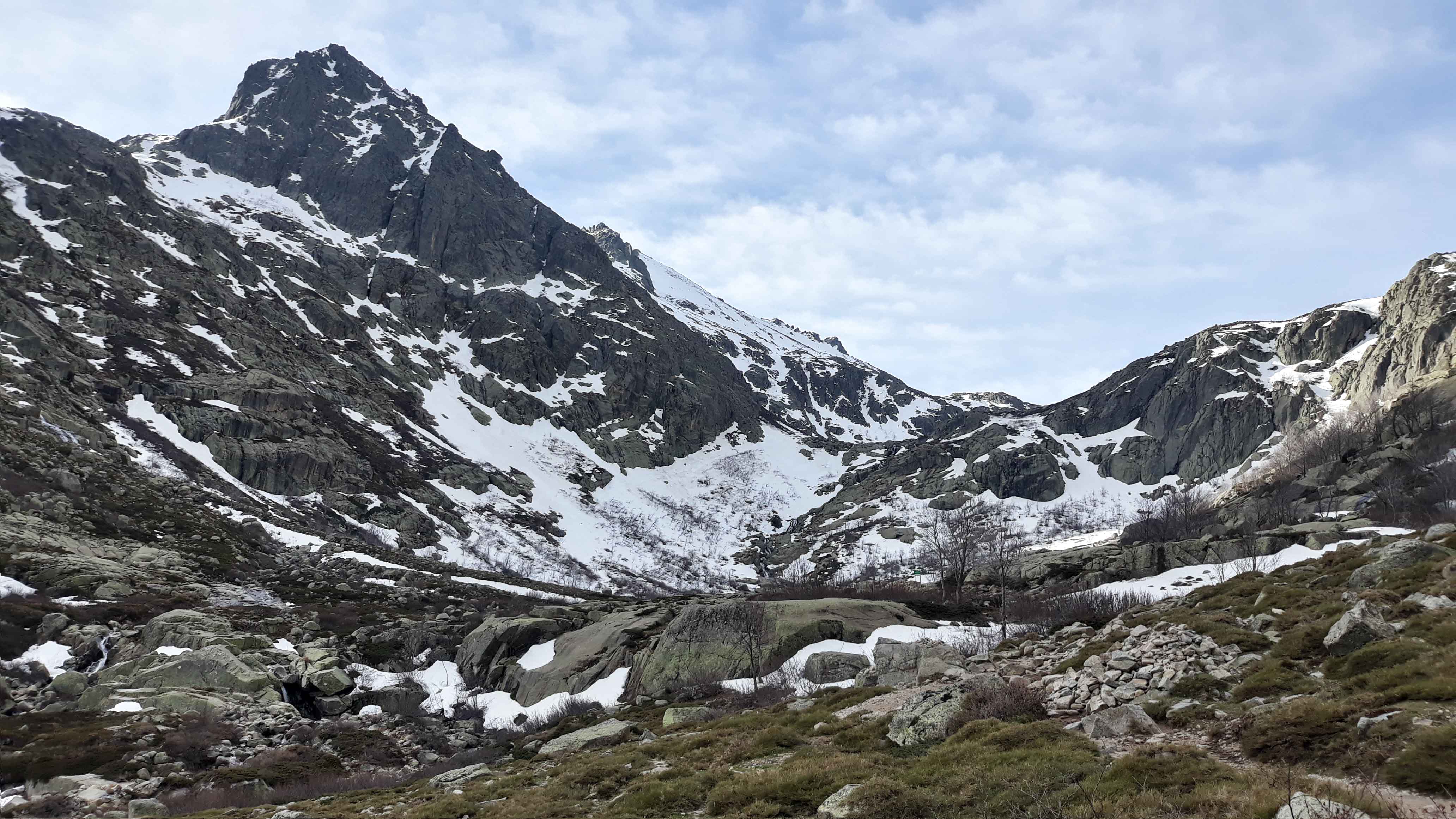 Retour dans la Restonica pour la dernière sortie du séjour, en neige transformée et en compagnie de Paul qui nous a rejoints. la nébulosité a gâché la vue mais le cirque de capitello est splendide