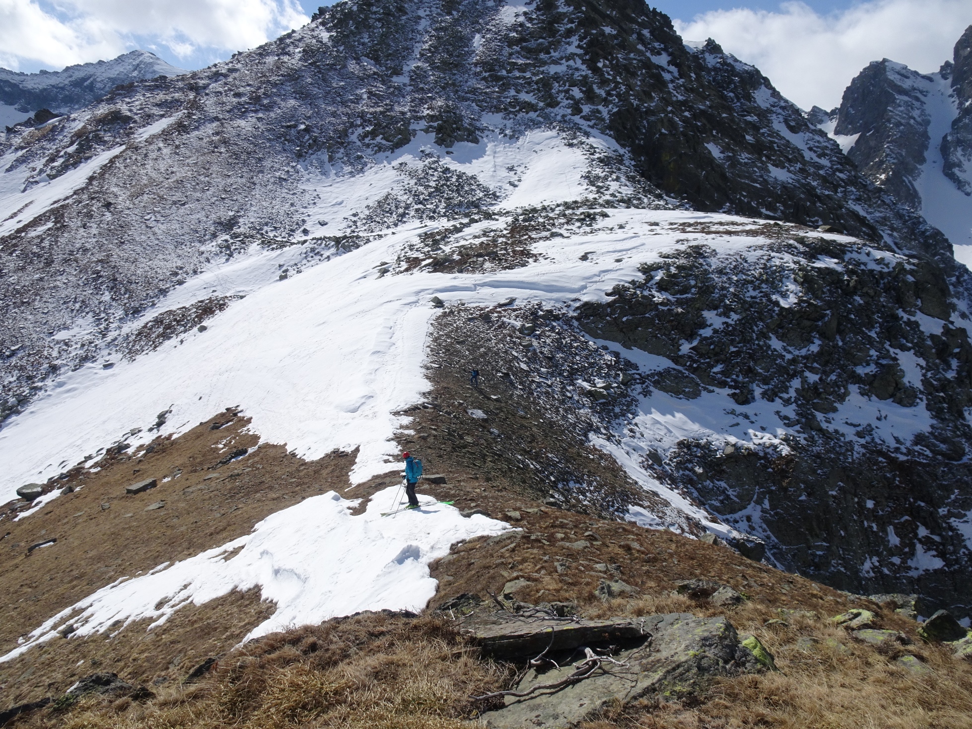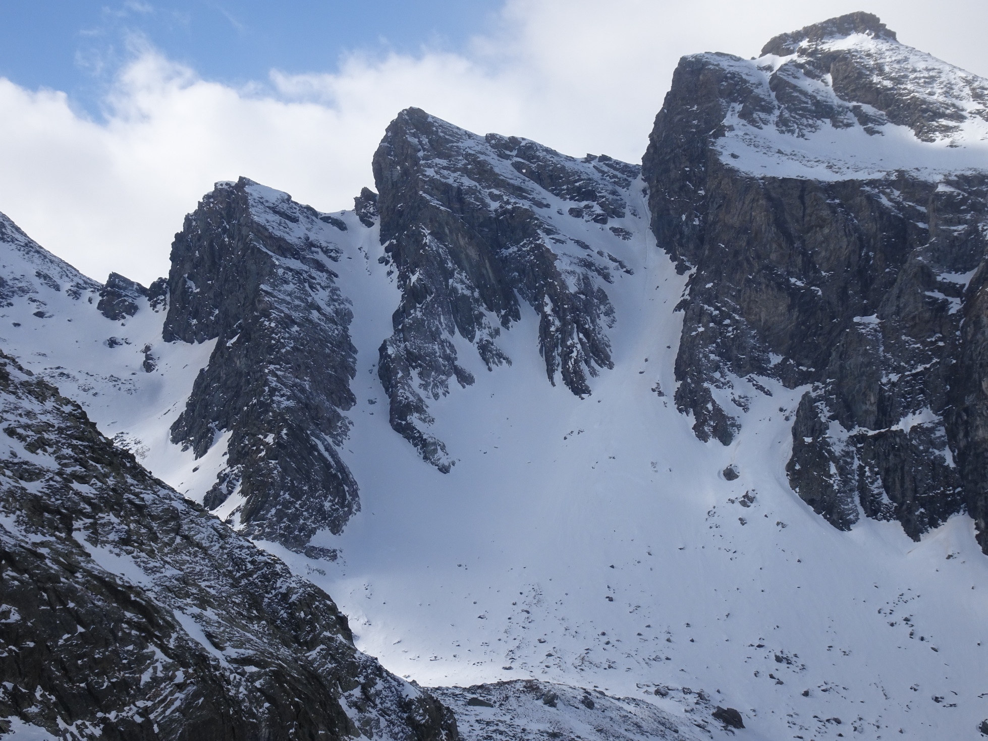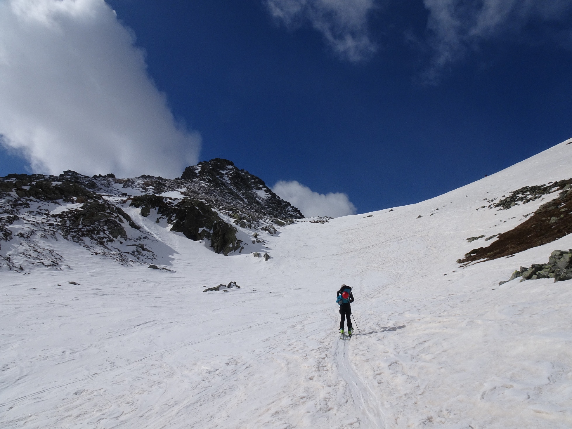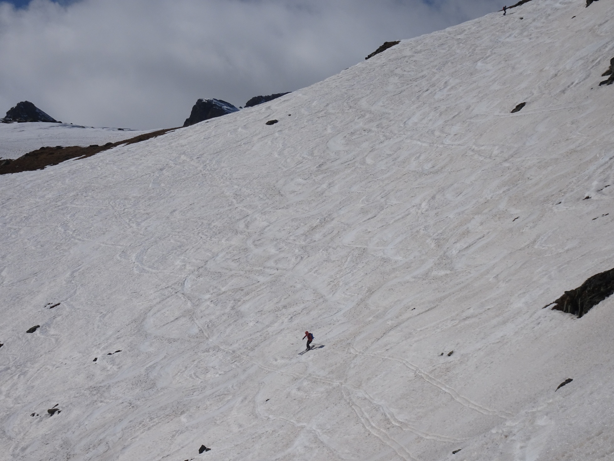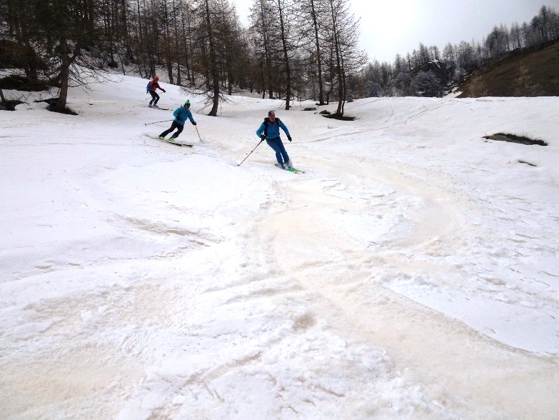 Parti pour la traversée sur le Pian della Mussa, en descendant le couloir nord ouest. Manque de neige dans le couloir, retour par la voie de montée, avec de la bonne neige on skies toujours jusqu'à la voiture. Mais ça ne durera pas longtemps