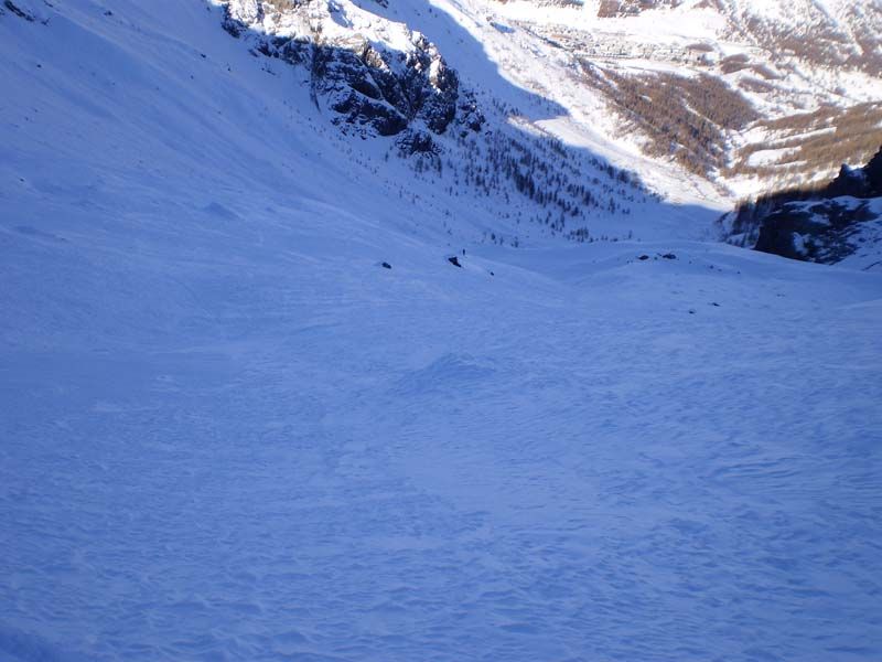 Une grosse plaque (cassure visible) est partie juste sous le sommet sans doute vers le 12 ou 13 est la coulée est allée jusque vers 2600. De quoi calmer l'ardeur de ceux qui auraient voulu parcourir le couloir O... Grâce à la pluie qui a précédé les chutes de neige, la liaison est correcte entre la couche dure (>2500) et la neige froide très légèrement compactée qui repose sur elle. On peut découper des blocs de 30 cm d'épaisseur et les prendre dans les mains, mais elle se fractionne si on tire dessus avec un bâton. Il faudra surveiller l'évolution, parce que les 15 cm de poudreuse au-dessus pourraient masquer des structures de plaques friables enfouies. Se méfier dans des pentes raides de l'impression de grande stabilité.