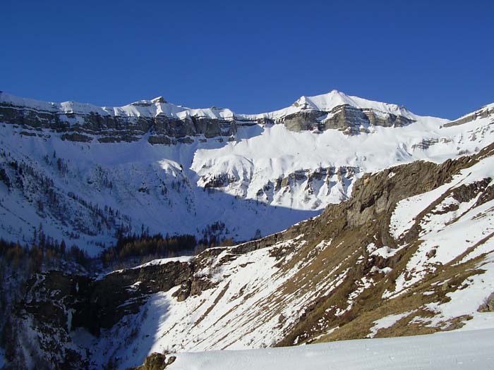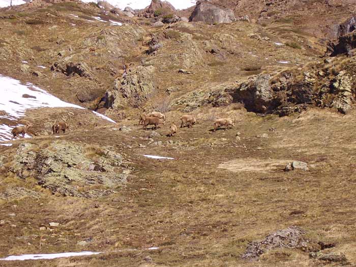 J'ai été enchanté par cette course, même s'il y a un portage conséquent (jusqu'à 1900 environ). La vue est splendide du sommet et la neige était excellente entre 2500 et 2000. Sous 1900, on déchausse, puis on peut rechausser vers 1700 et suivre le sentier, avec de nombreuses interruptions et passages sur herbe. Nous avons été assez surpris de rencontrer, à la montée, à la lisière de la neige, une harde d'une quinzaine de bouquetins, qui peinaient dans les passages enneigés.